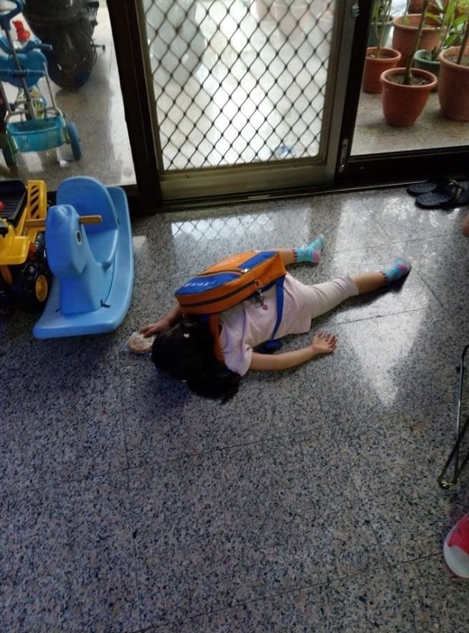 開學好累...女兒回家「秒斷電倒地」 爸直呼:第一天而已捏!