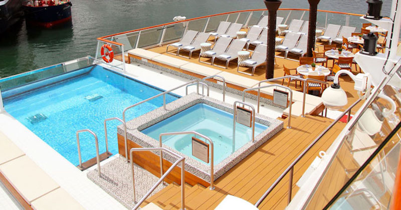 ▼航行過程中自然也不是無聊的,除了Wifi之外,船上還有2個游泳池、2座電影院、健身中心、酒吧、水療SPA、各式商店等。游泳池一個是可伸縮屋頂的主游泳池,一個則是船尾的無邊際泳池。