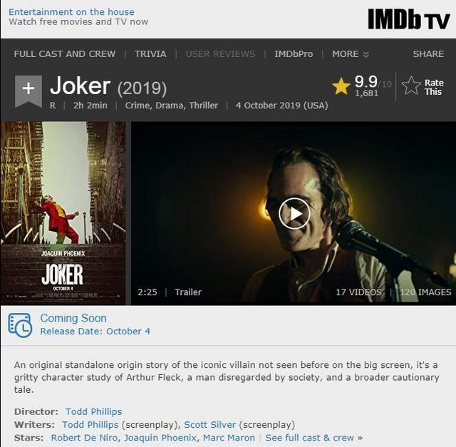 ▼現在《小丑》在IMDb、爛番茄等網站上的評價也很正面,IMDb評分高達9.9、爛番茄新鮮度一度維持在86%。毫無疑問,又一部好電影誕生了。
