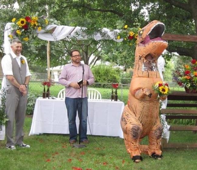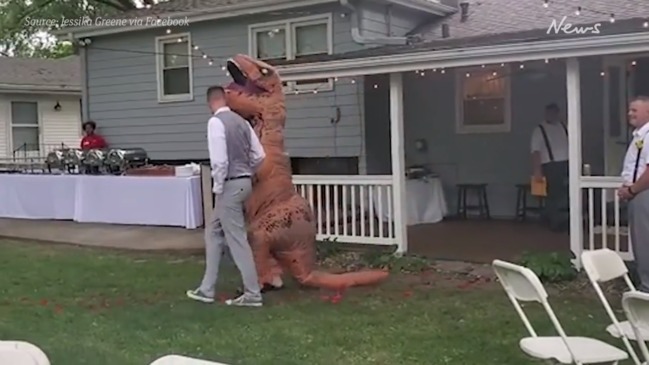 超幽默伴娘「穿恐龍裝」現身婚禮 新娘大笑支持:妳做得很好