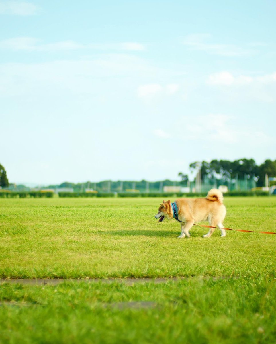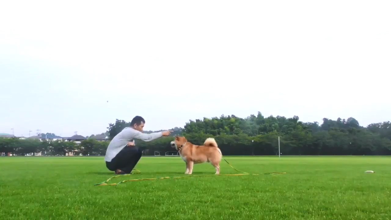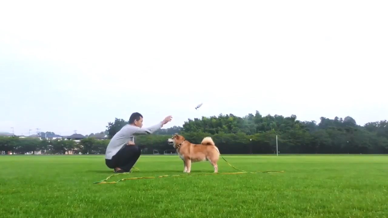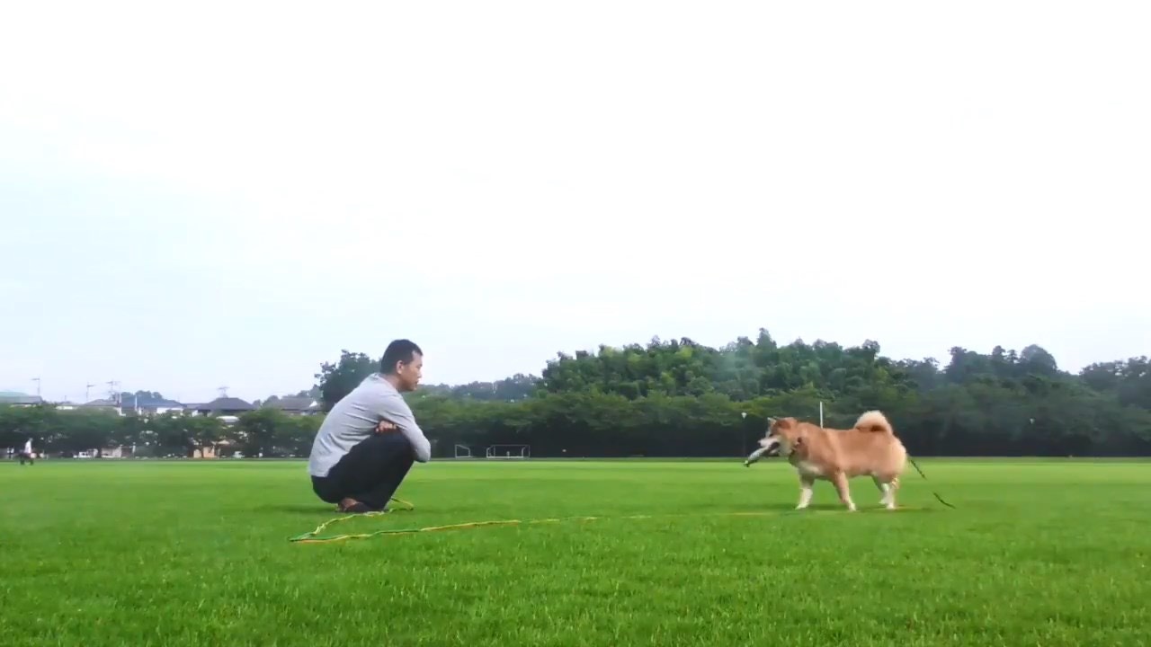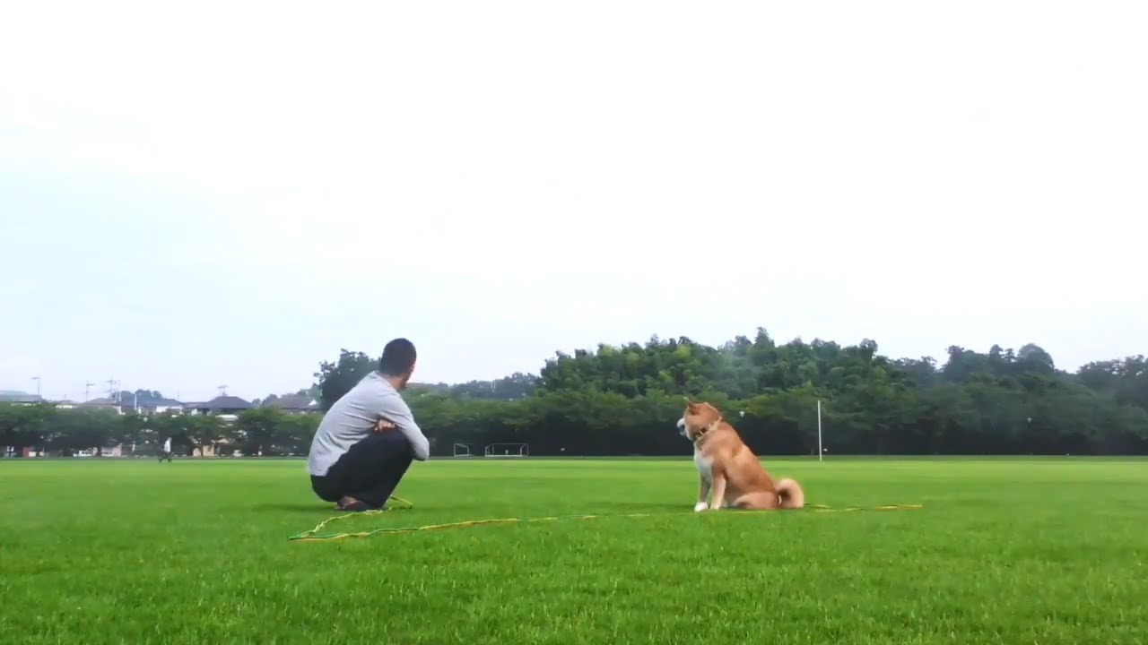 ▼主人帶丸太郎到廣闊的草地上玩遊戲,他將玩具丟出去後,丸太郎沒有盡情奔跑,反而一動不動,還與主人對視。