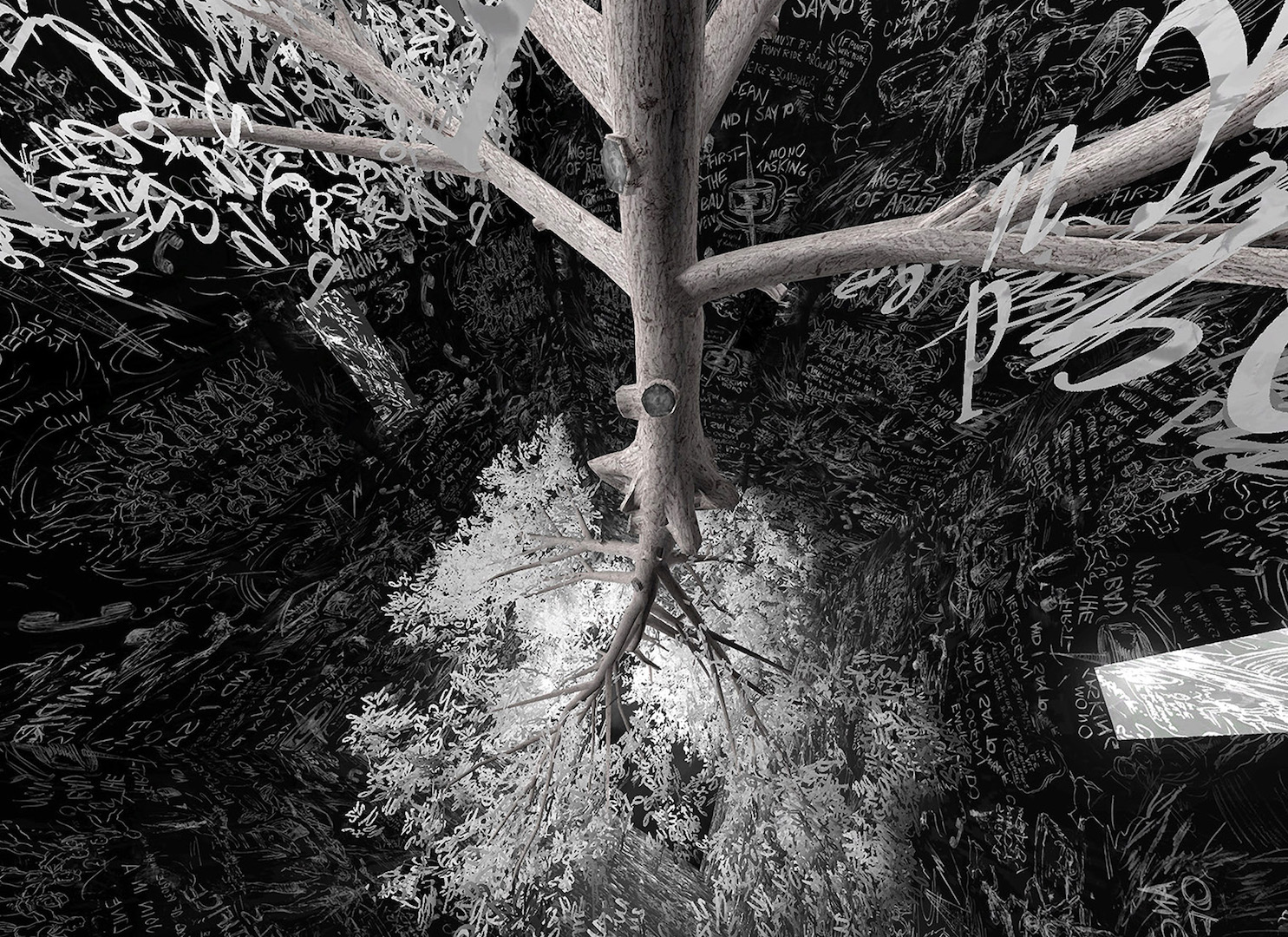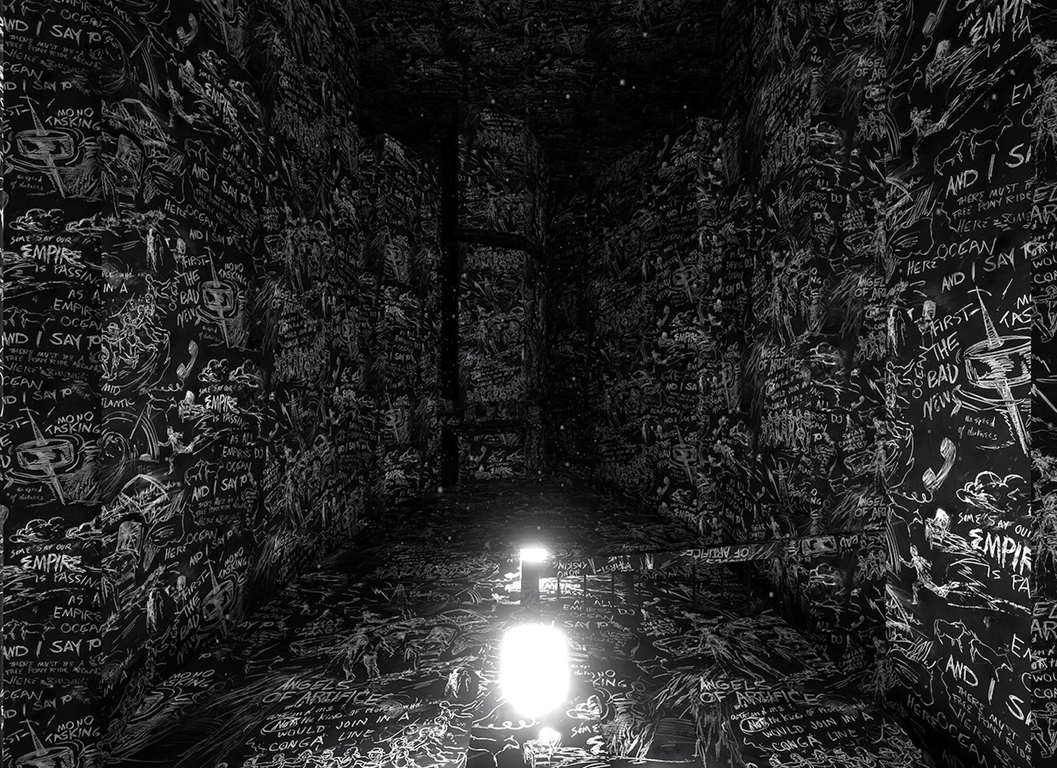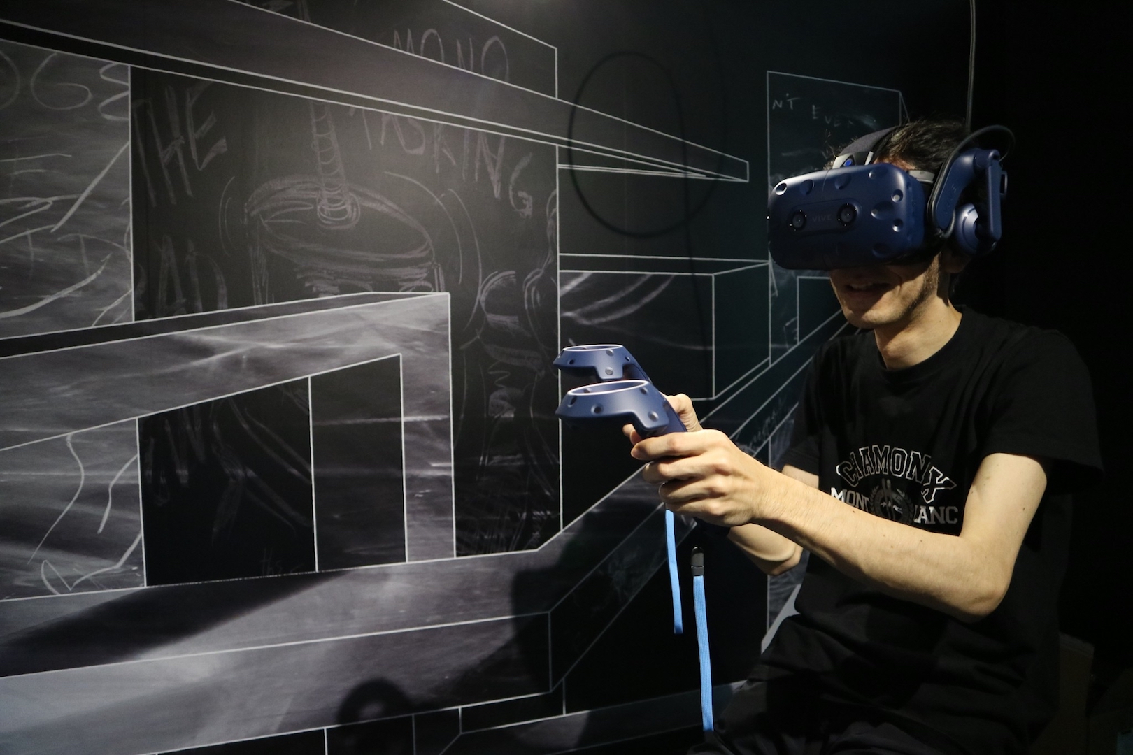 ▼沙中房間:由美國傳奇音樂家與台灣新媒體藝術家共同創作,本次最吸睛的「虛擬實境」裝置,探訪者需要戴著VR裝置來探索這項展品,完全融入藝術品的虛擬世界之中,感受作品中的文字、圖騰、符號、聲音。
