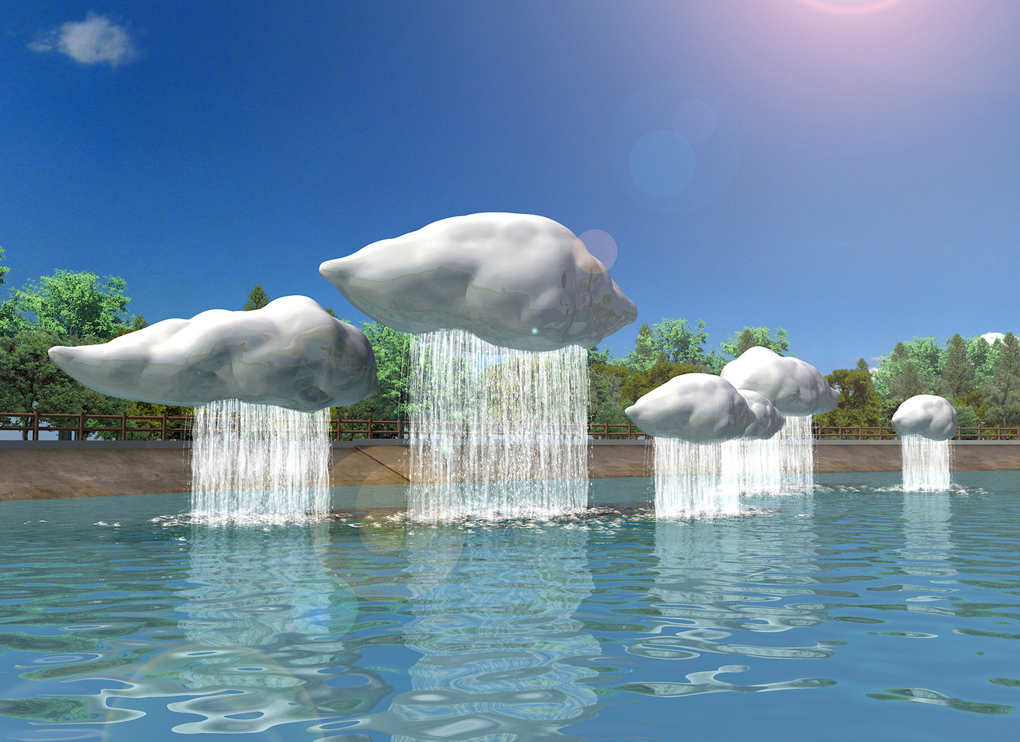 ▼歡聲笑語:來自新加坡的藝術家,創造一系列漂浮的雲朵,在湖面上空盤旋、雨水繚繞,營造出寧靜祥和的景象。這看似卡通中才會出現的雲朵,帶著荒謬與幽默感,漂浮在湖面得樣子看起來非常療癒。