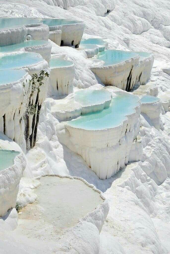 棉花堡位於土耳其丹尼茲利市西南部,這裡可說是大自然給予人類最好的禮物之一!原來這些從山頂流下來的泉水在經過數千年的堆積、鈣化之後,溶解了岩石中大部分的礦物質和石灰質,讓這裡的地貌變得層次分明,遠遠看去就好像無數堡壘一樣!