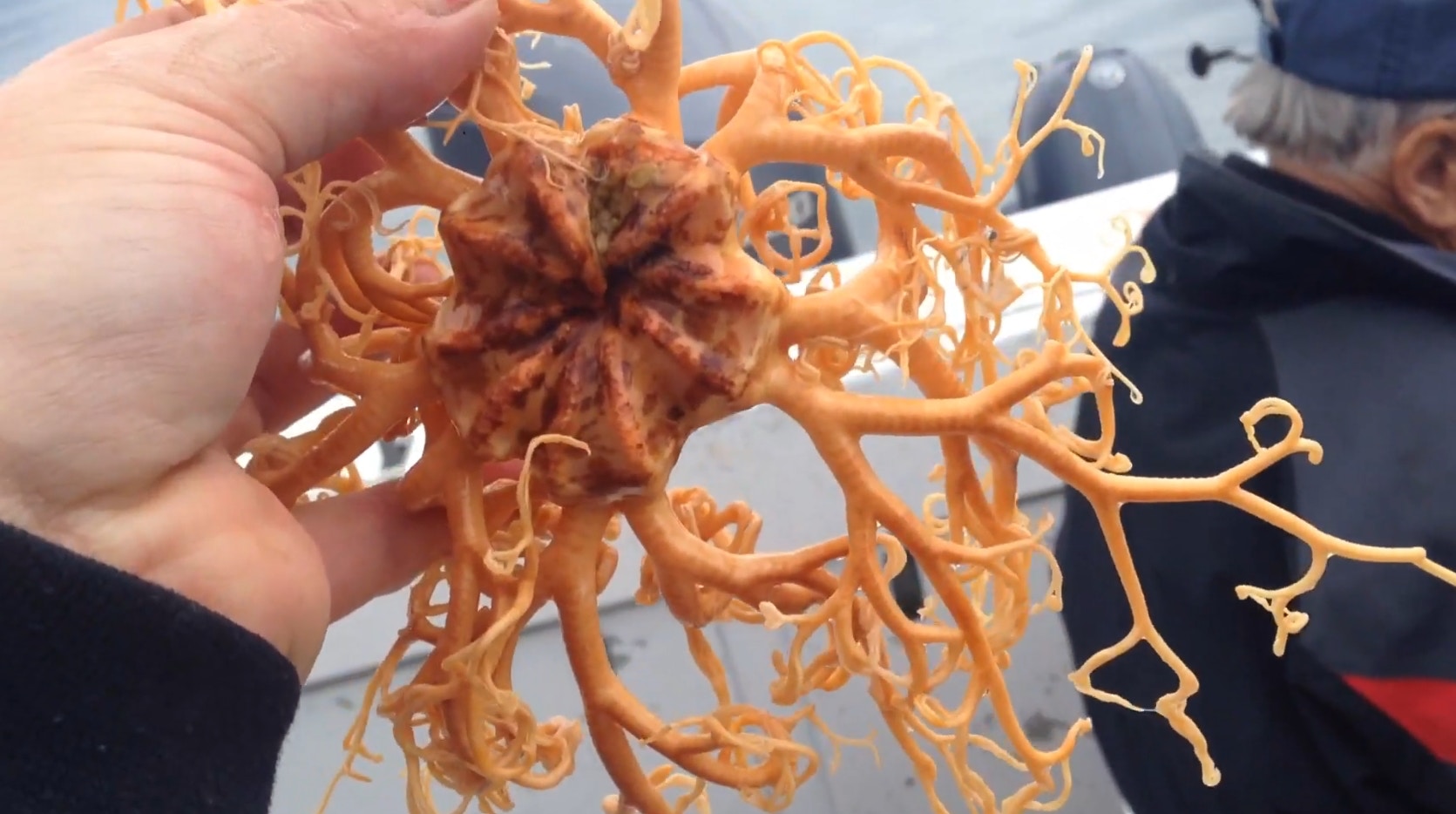 ▼專家指出,這種生物叫「籃海星」(The Basket Starfish),是一種棘皮動物。牠們平時棲息在深海近海床處,靠蜘蛛網一樣的觸手呼吸、獵食。按理來說,籃海星是不會漂浮在水面上的。