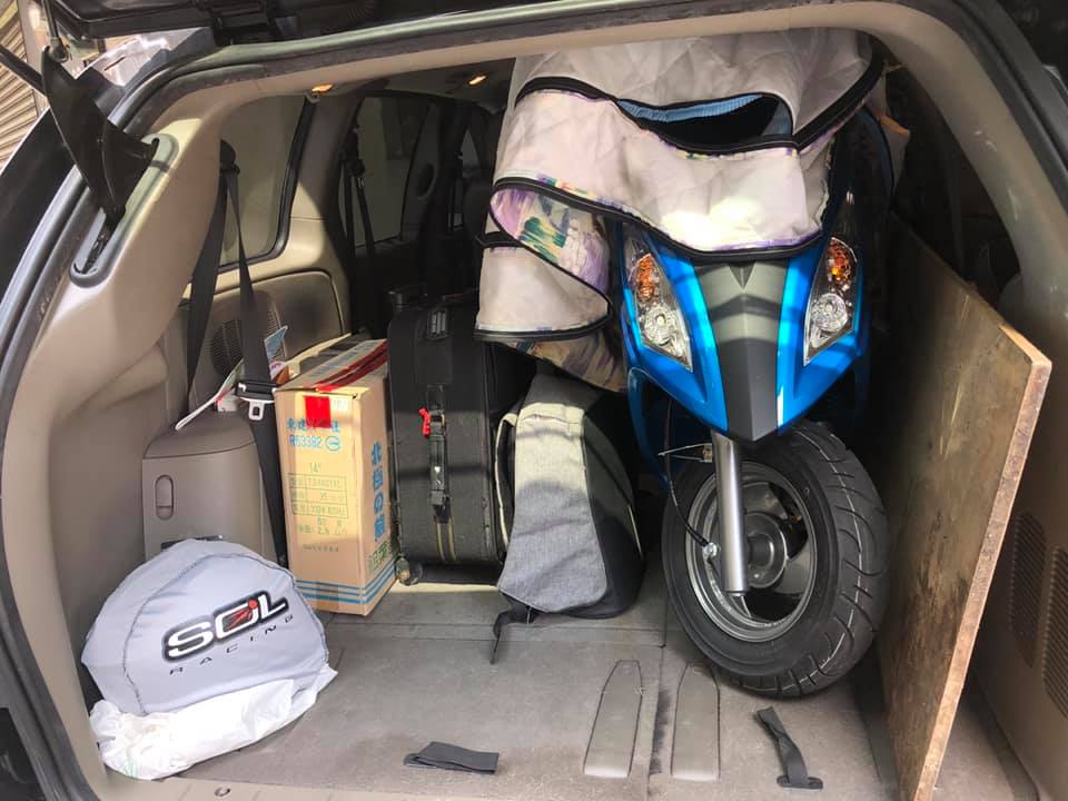 ▼不久後,整輛機車就將車子後車廂塞得滿滿的,爸爸還用一塊布將車身罩起來保護,旁邊就是有原PO的行李。「爸爸牌」的託運作業讓大家都直呼「這就是父母啊」!