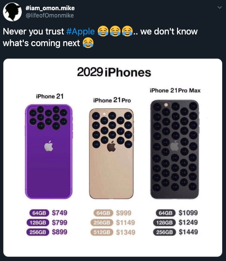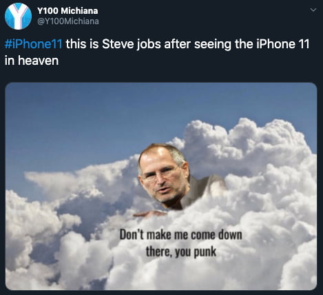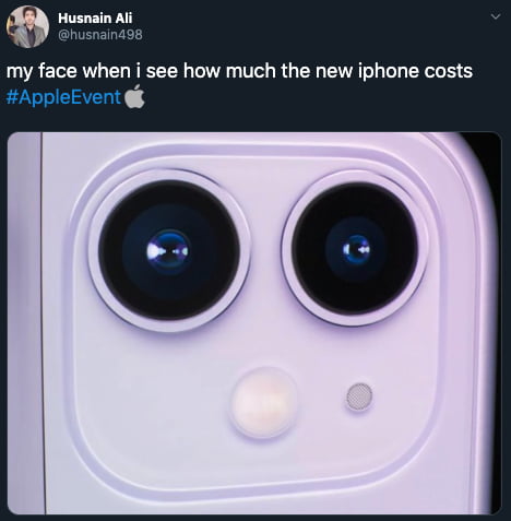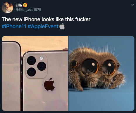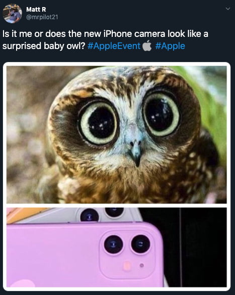 2019年09月12日蘋果的秋季新品發表會備受矚目。這次蘋果發表了iPhone 11,共有白色、黃色、綠色、黑色、紅色以及紫色6種顏色可供選擇,售價為699美元起。iPhone 11的雙鏡頭模組引發網友熱議,大家還製作了很多梗圖,一起來看一下~