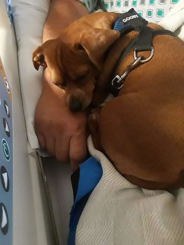 ▼來到醫院探望把拔後,牠什麼地方都不想去了,只是乖乖地躺在把拔的身邊…