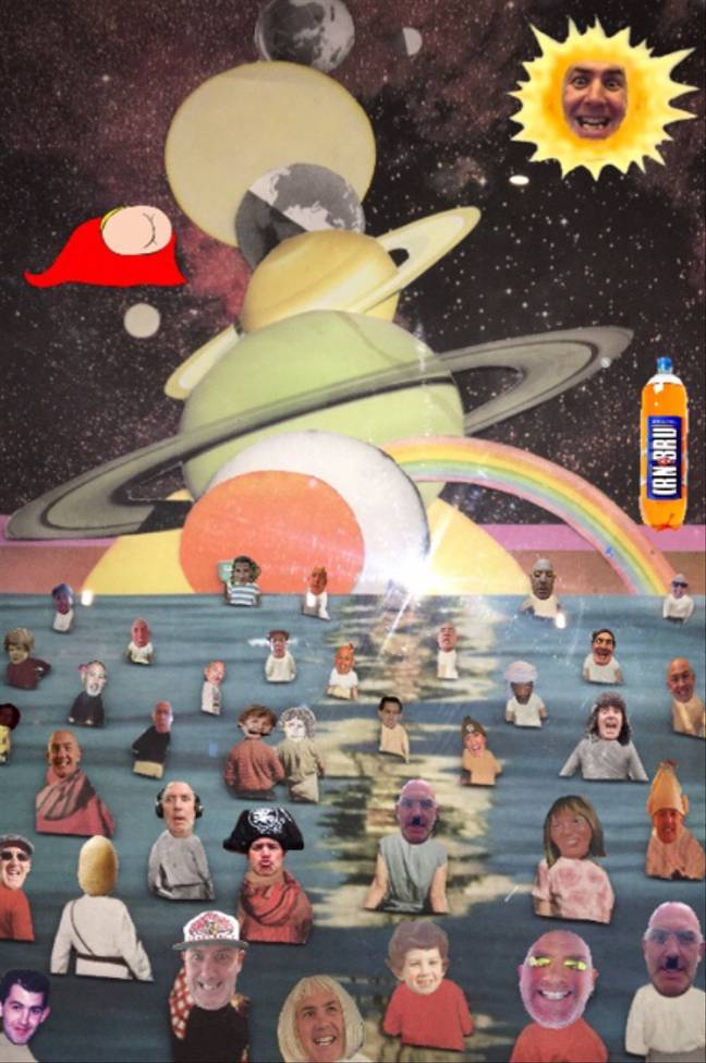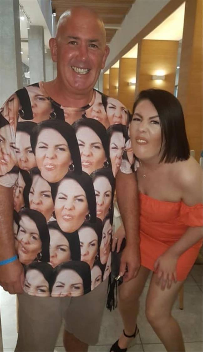 ▼Megan也曾送給爸爸類似的禮物。爸爸50歲生日時,她特別準備了一件印滿爸爸滑稽臉的圍裙。父親節時她準備的禮物更酷:「我們一起去酒吧時,看到牆壁上掛著一張照片。我爸說如果把照片中所有人的臉都換成自己的,一定很好笑。我特別找來照片後製了一下,還在其中混入了一顆馬鈴薯。」