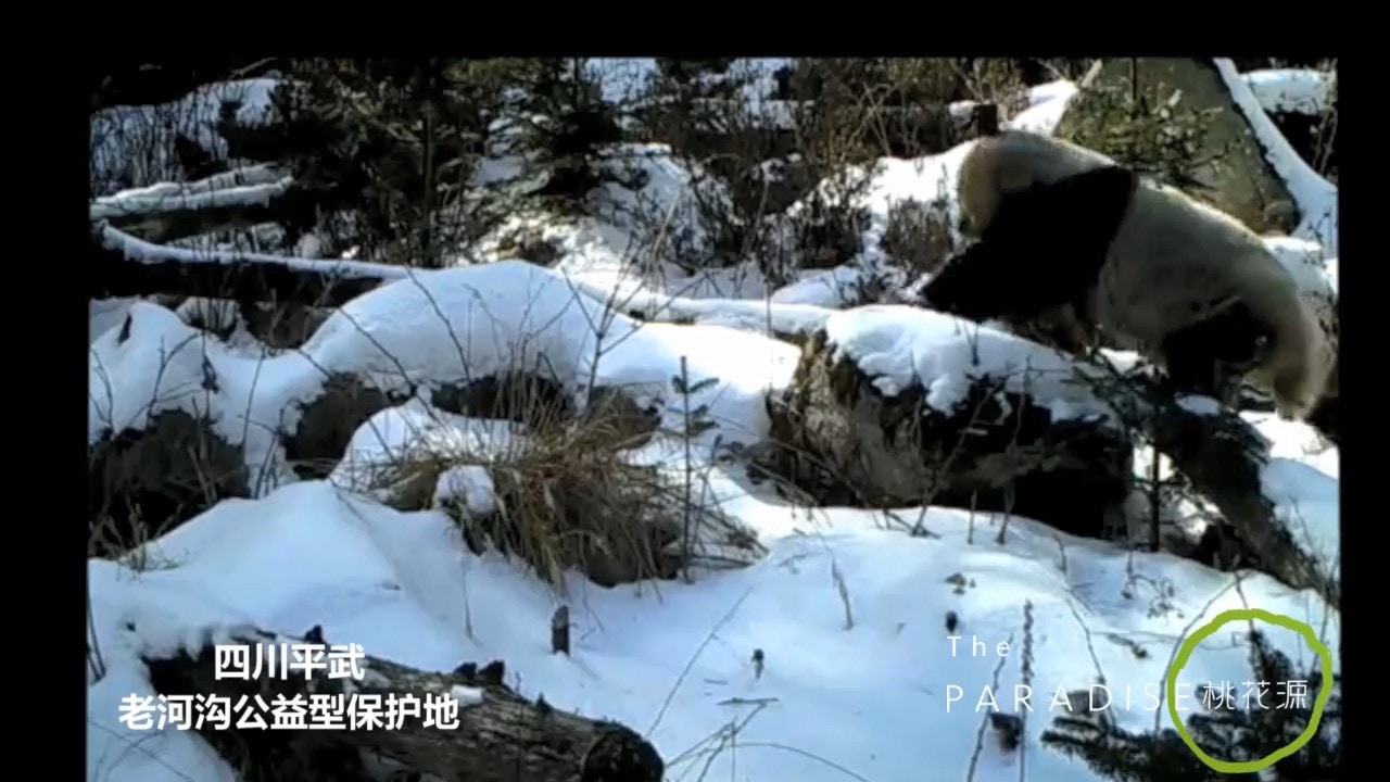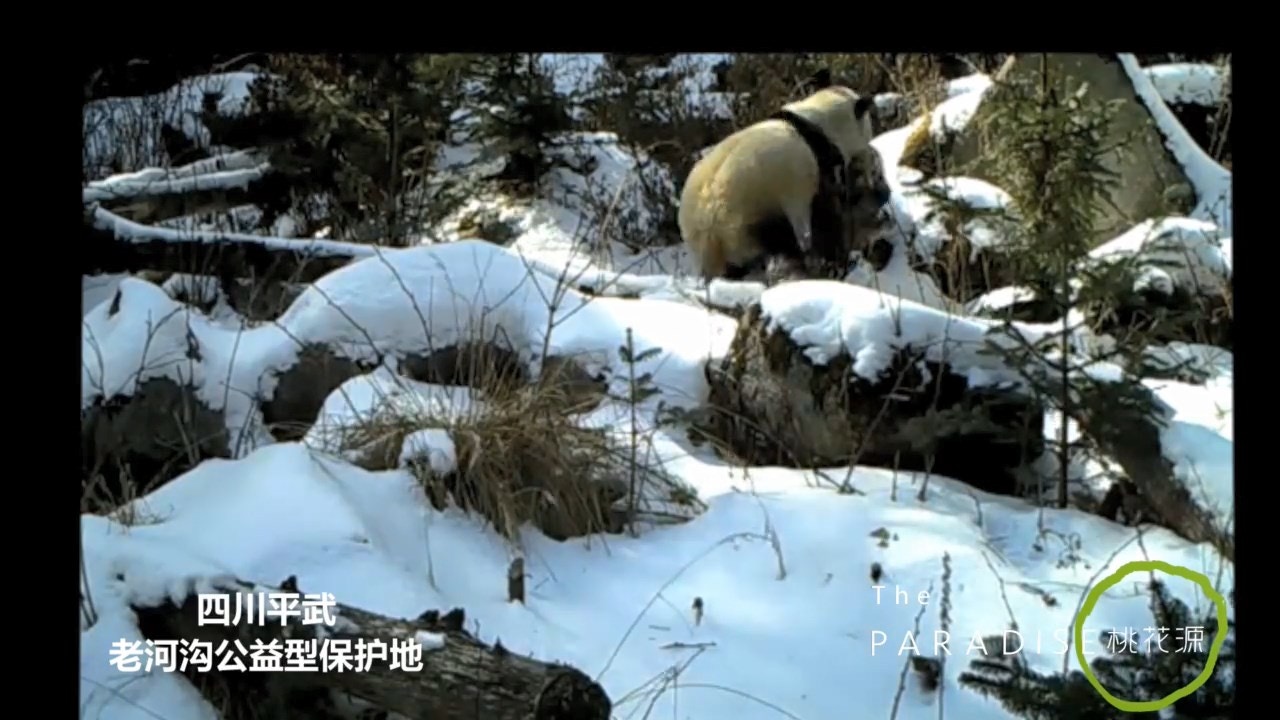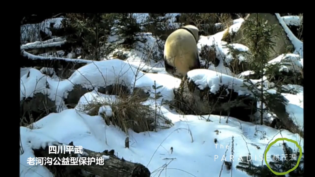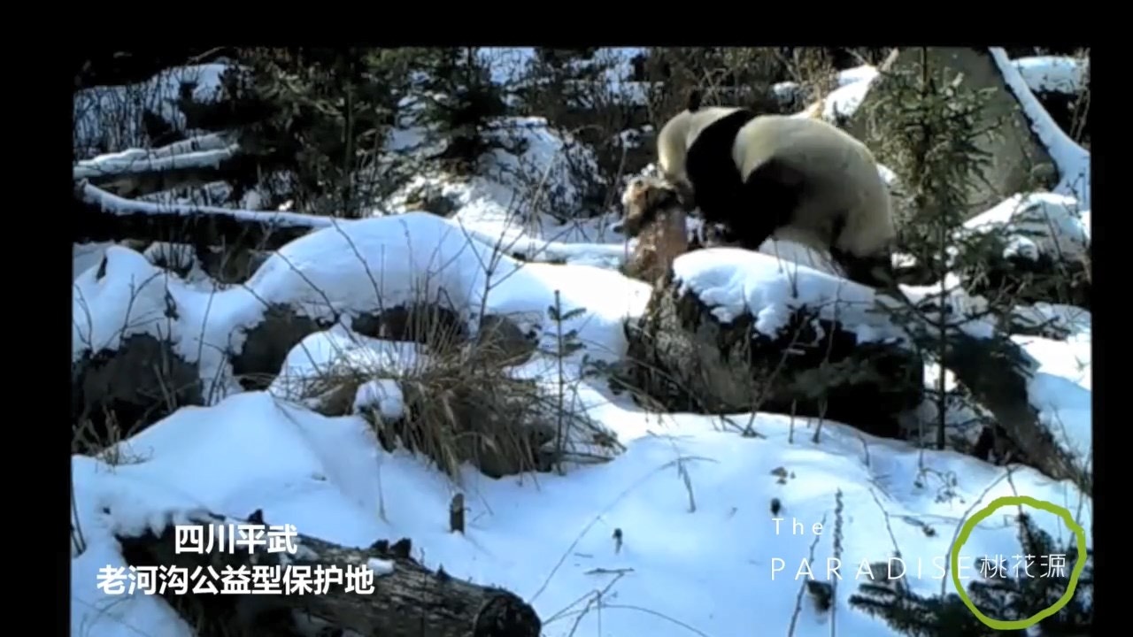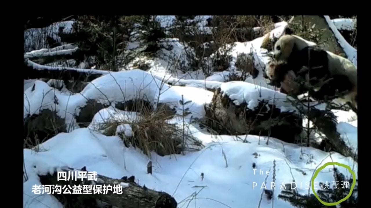 ▼當時熊貓媽媽叼著寶寶的後勁皮,在高海拔地區的雪地上行走。熊貓寶寶雙手張開,一動也不動,真是個乖巧的孩子。
