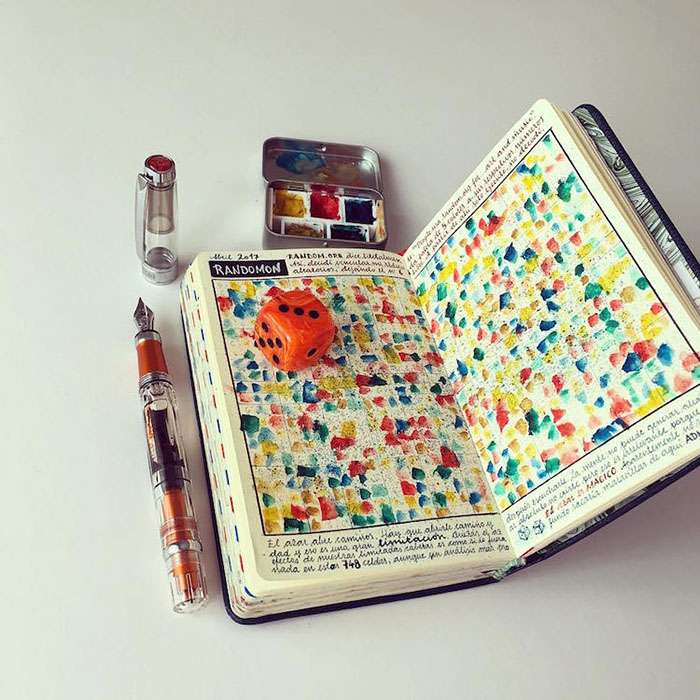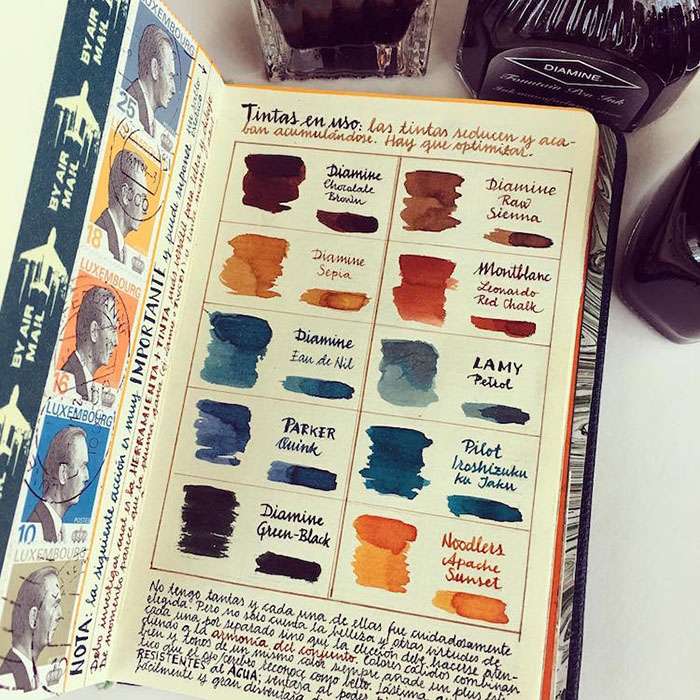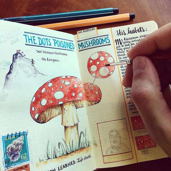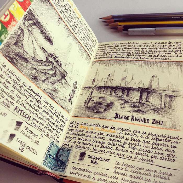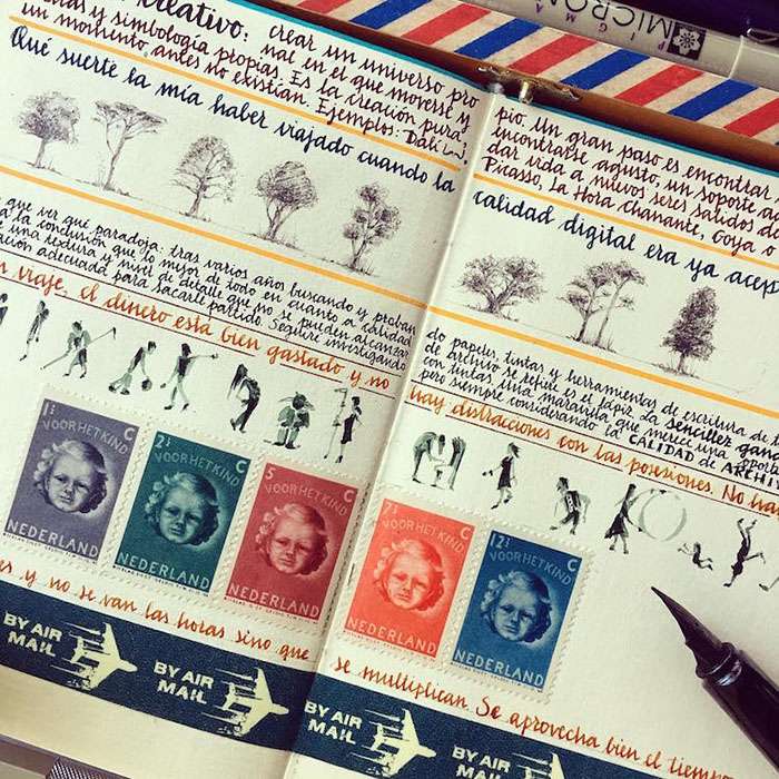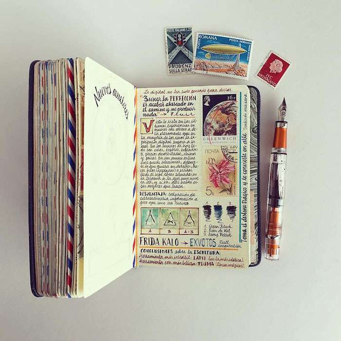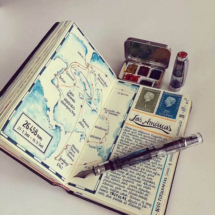 ▼何塞的手帳本就是個藝術品,他利用水彩畫、鋼筆繪畫,再加上來自各地的攝影、郵票等元素,創造出獨一無二的手帳。