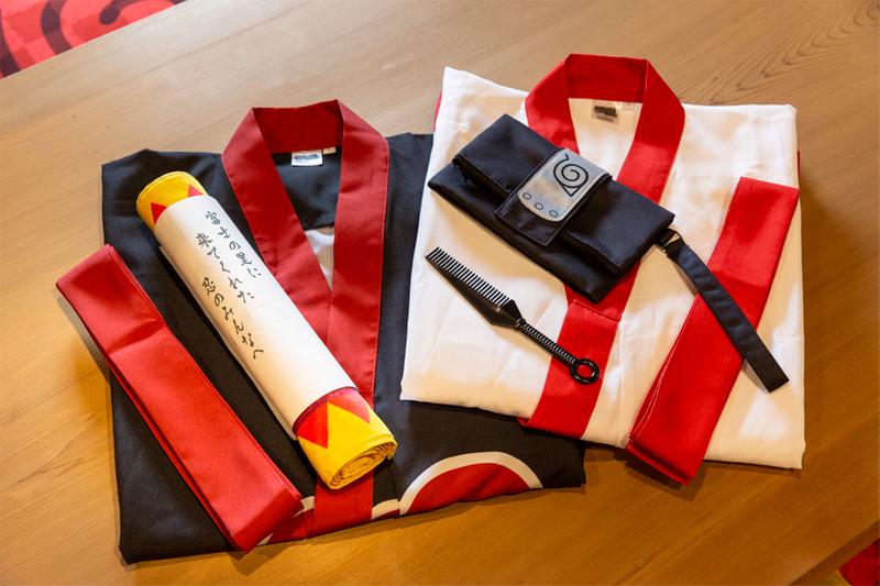▼如果入住火影主題房,還有入住特典,能拿到印著「四代目火影」和「曉」圖案的浴衣、苦無造型梳子、火影忍者主題毛巾,還有護額造型的包包,這一套讓人超心動~