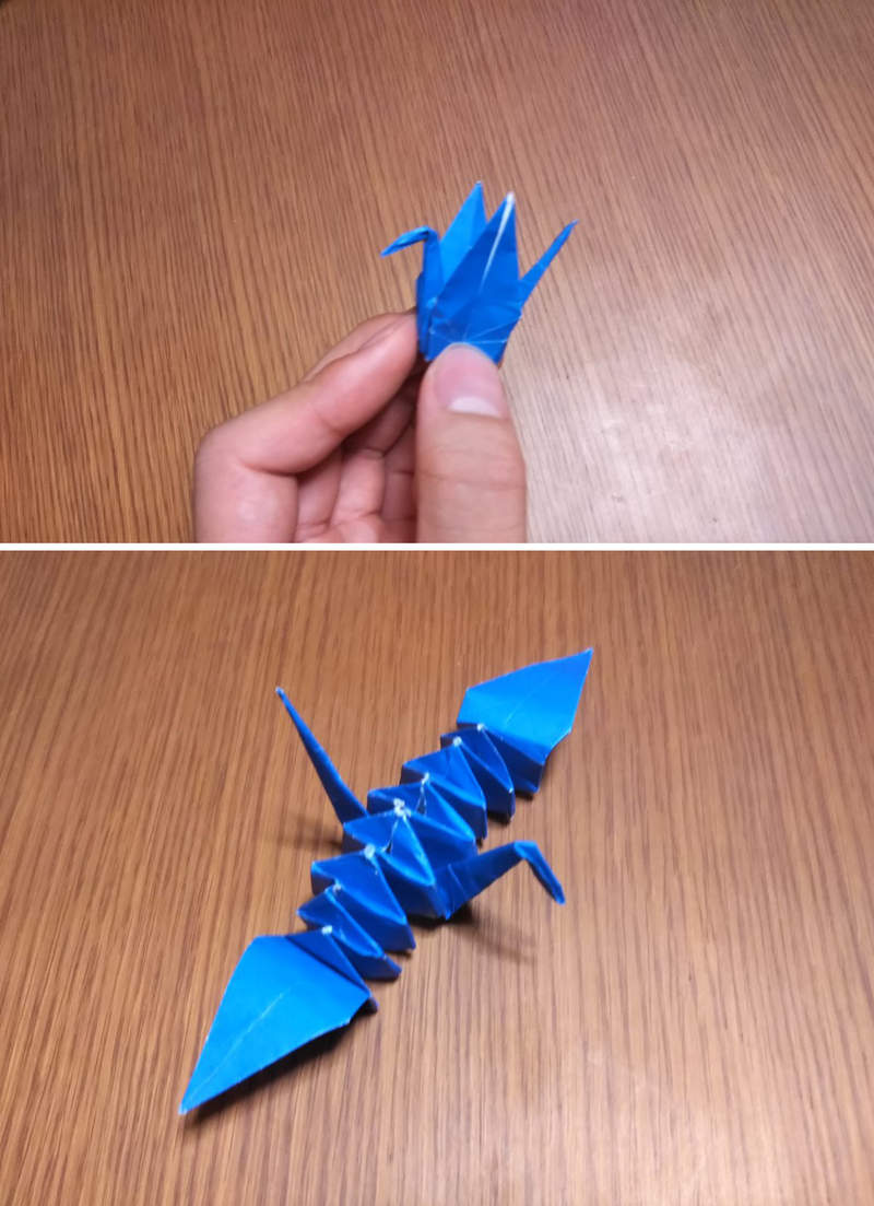 ▼像管風琴一樣可以伸長縮短的紙鶴!