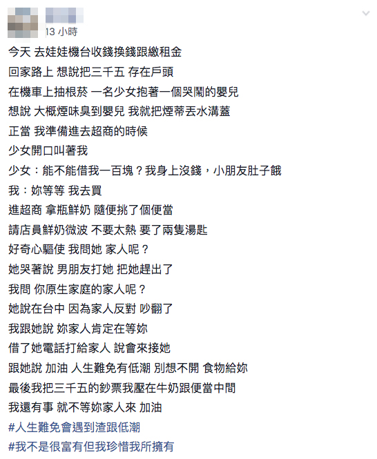 2019年09月18日人生總是會遇到渣跟低潮…日前一名男網友在臉書社團PO文表示遇到一名無助小媽媽,她因為擔心孩子肚子餓,只好鼓起勇氣跟自己討錢買食物。原PO看到這一幕,二話不說買食物、把收入都給她,還借手機讓對方找家人。