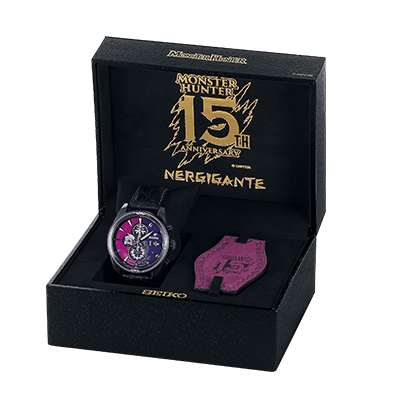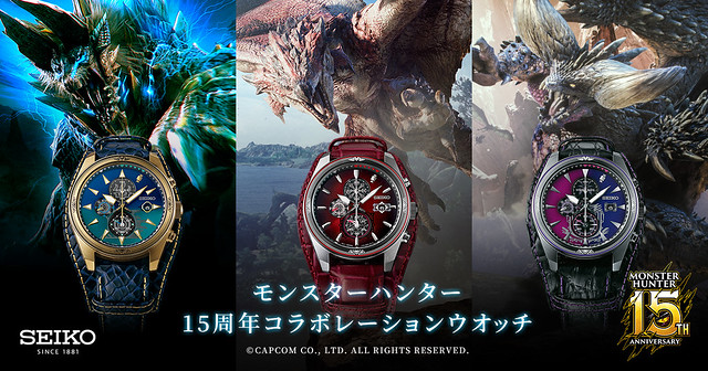 ▼CAPCOM與SEIKO聯名推出的15週年紀念手錶一共有3種款式,都是以遊戲中經典的魔物為主題。藍綠色的手錶是剛剛回歸《魔物獵人 世界》的「雷狼龍」主題;紅色手錶的主題是魔物獵人系列的金字招牌「雄火龍」;黑色的則是《魔物獵人 世界》的招牌魔物「滅盡龍」。