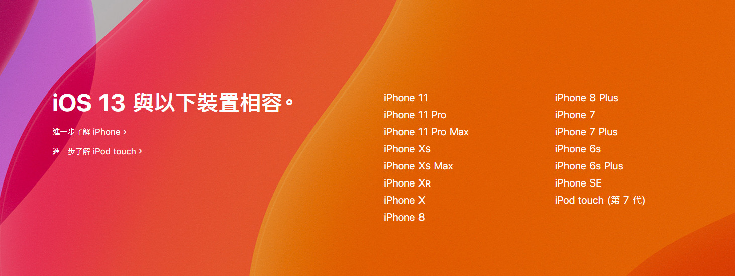 目前支援升級 iOS 13 的裝置,包括了第七代 iPod touch 和所有 iPhone SE、iPhone 6S 以上的機型。