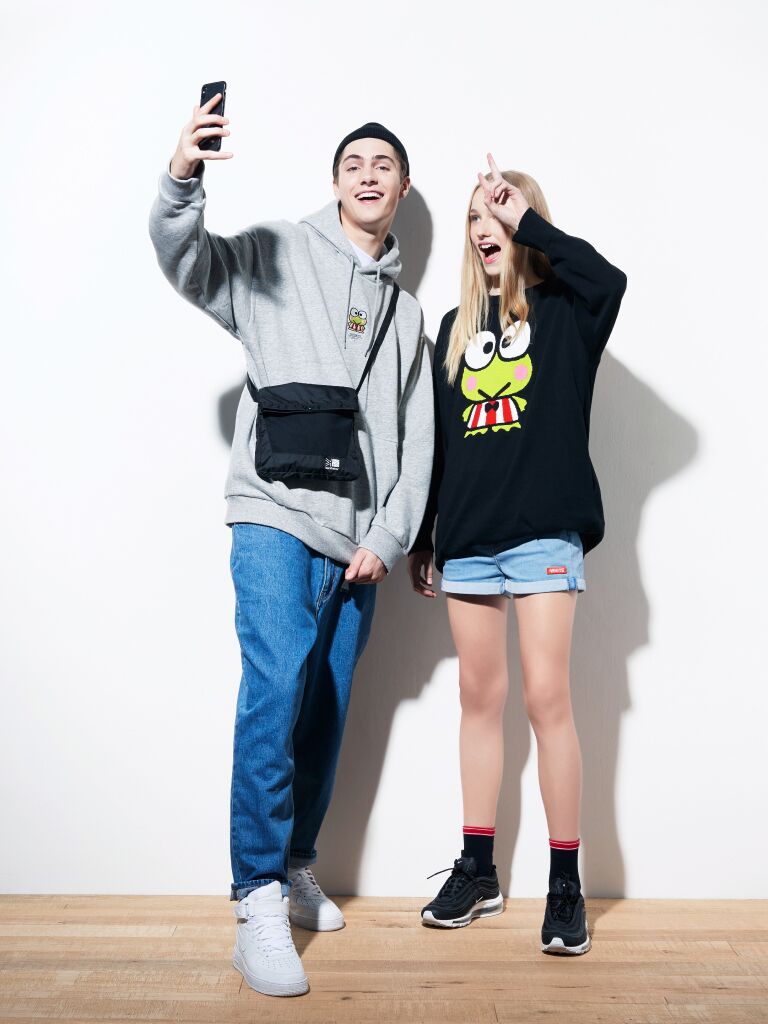▼初秋必備針織連身裙,在黑、灰兩色上的青綠色大眼蛙格外顯眼;搶眼的大眼蛙造型帽T,帽上加了大眼蛙招牌電眼,童趣十足,穿起來青春洋溢。