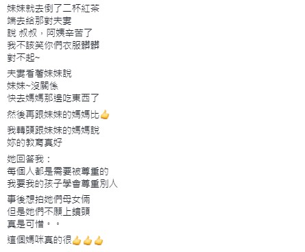 許多網友看完原po的分享後,紛紛留言表示:「很棒的家教,用比喻的讓孩子懂工作的辛苦要尊重別人,有智慧的媽咪」、「身教言教很重要」、「教育要從小紮根!」能夠用這樣的方式來教育小孩,相信女童長大之後一定也會成為一個很體貼、暖心的好人!