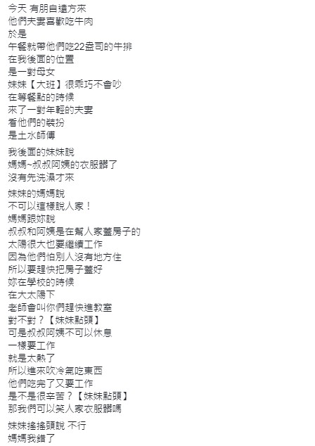 2019年09月20日每個孩子都會有「童言無忌」的時候,能夠在他們做錯事之後不用責罵、體罰的方式,而是選擇機會教育的父母親才是正確的教育方式!日前就有一位網友在臉書社團中分享了自己的見聞,原來他在餐廳用餐時遇到了一個讀幼稚園大班的女童批評其他客人的裝扮,最後女童媽媽的身教方式也讓他非常感動!
