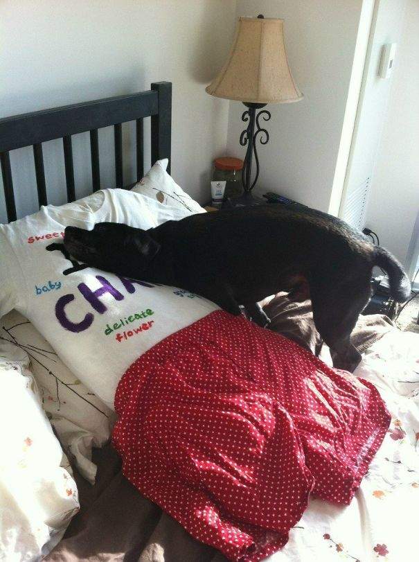 ▼「我工時太長了,所以我老婆開玩笑地做了一個假枕頭,套上我的衣服,顯然這呆瓜分不出來有什麼差別。」