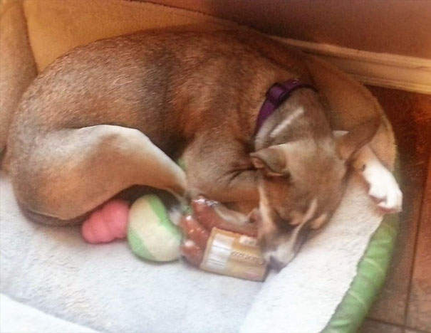 ▼「我的狗堅持要跟這3根沒開封的香腸睡覺。」