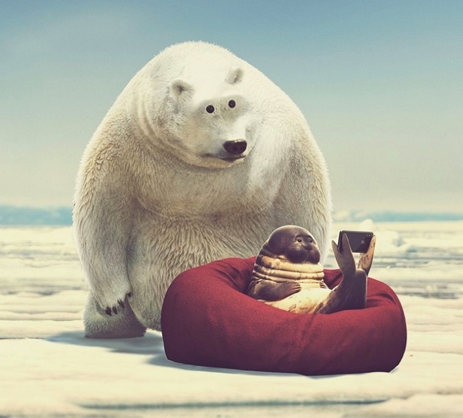 ▼浮冰都要融化了,北極熊還坐在懶骨頭上玩手機。關注一下周圍的環境啊!