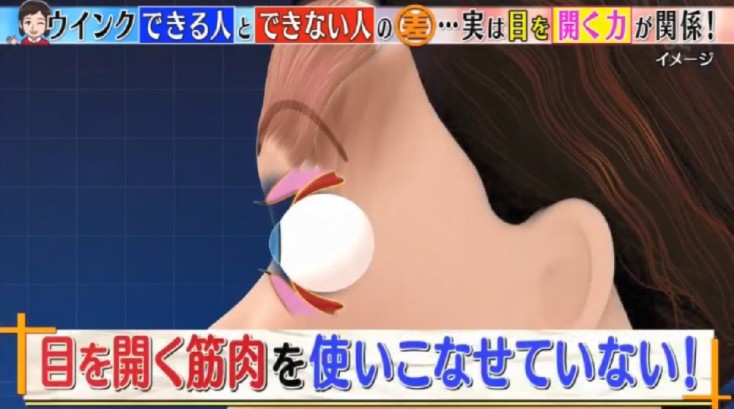 ▼節目也找來了臉部肌肉專家間間田老師來進行講解,她表示無法閉上單邊眼睛是因為眼瞼肌鍛煉不足的緣故。因為在「眨單眼」時,關鍵並不在如何閉上一邊的眼睛,而是如何在雙眼閉合時將其中一隻眼睛睜開!她也表示自己9年前雙眼非常無神,不過經過持續多年的眼瞼肌訓練後,如今眼睛不僅變得更大,看起來也炯炯有神!