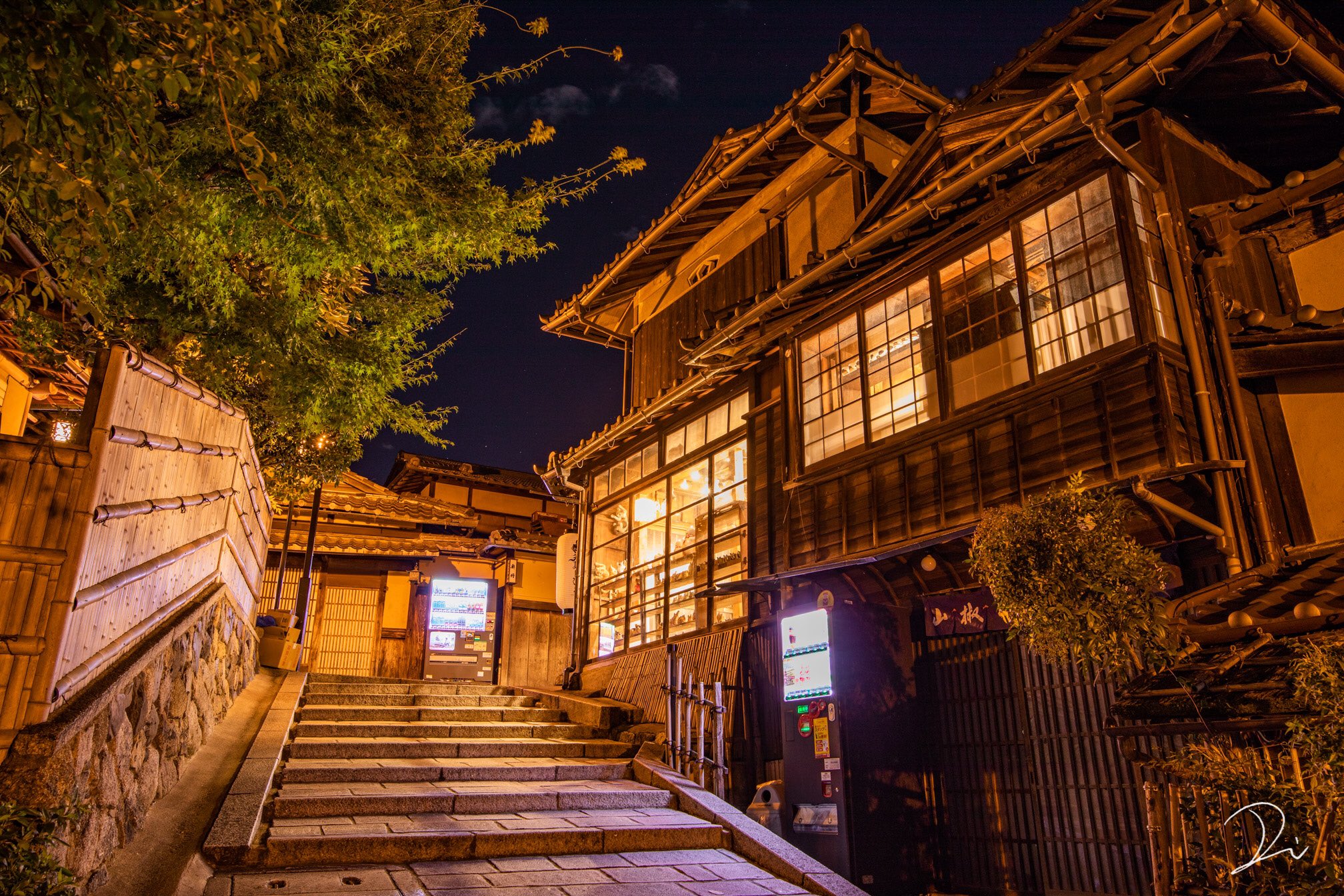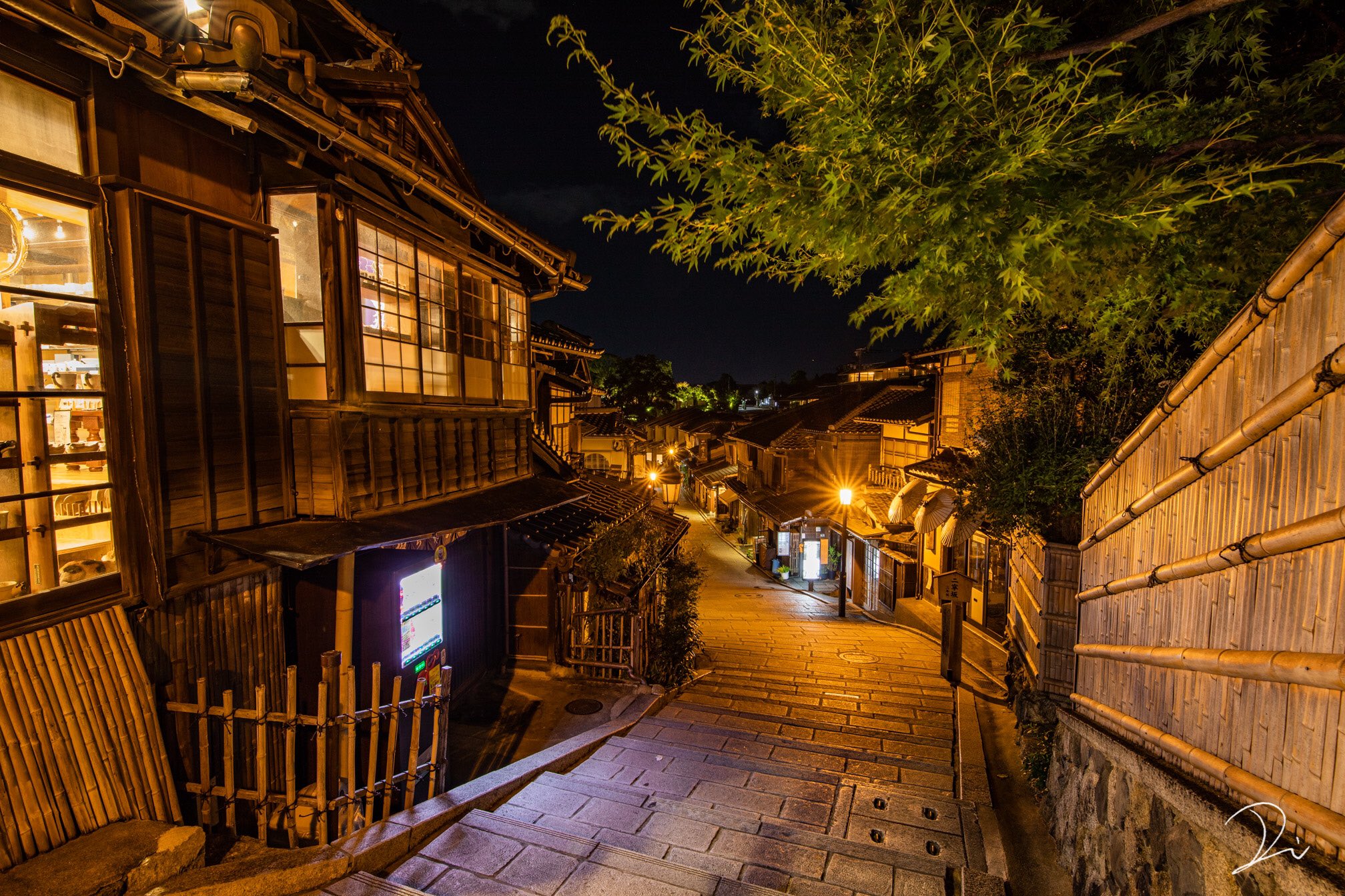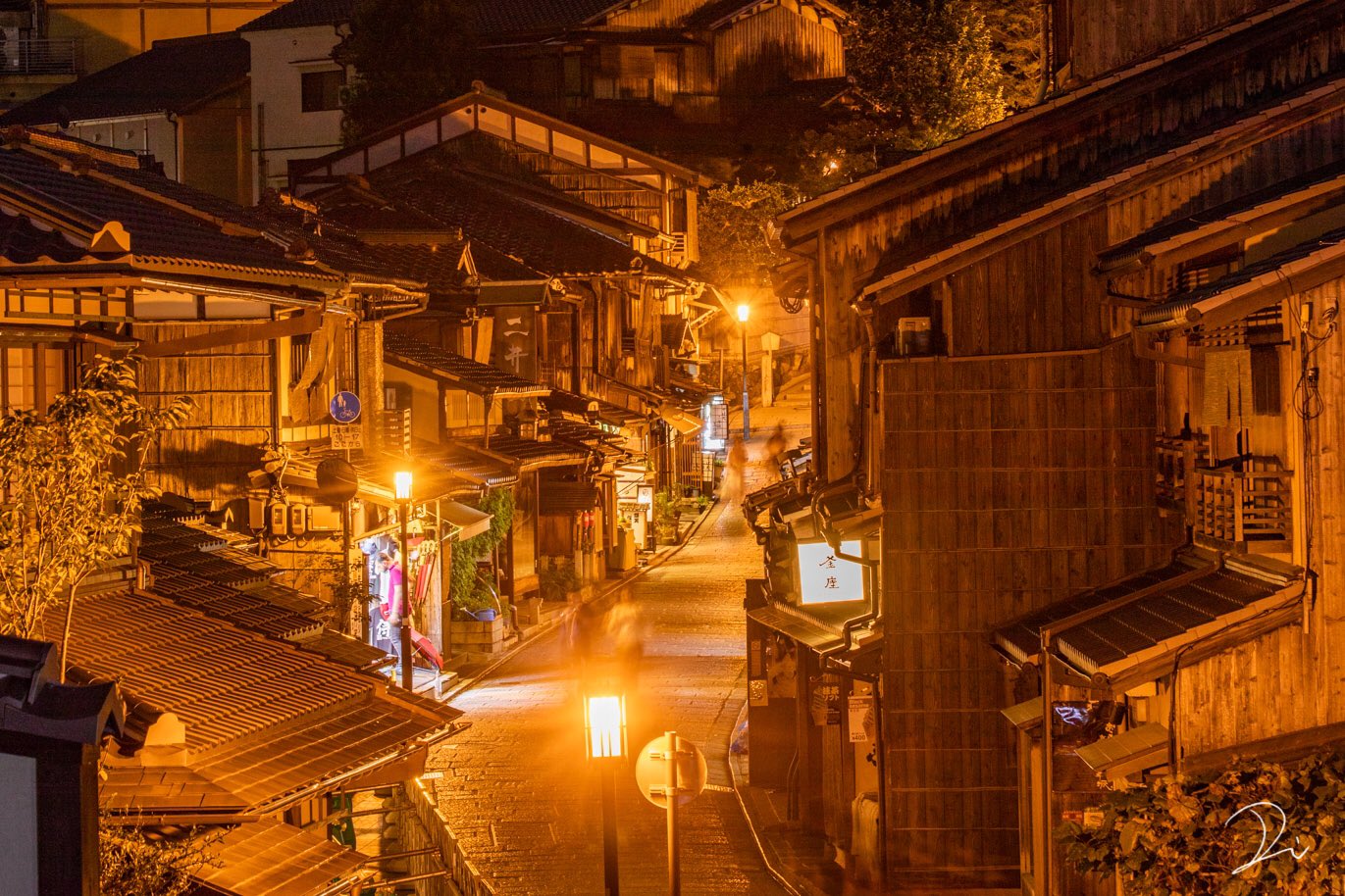 ▼有日本攝影師拍下京都入夜後亮起昏黃街燈,空無一人的老街。