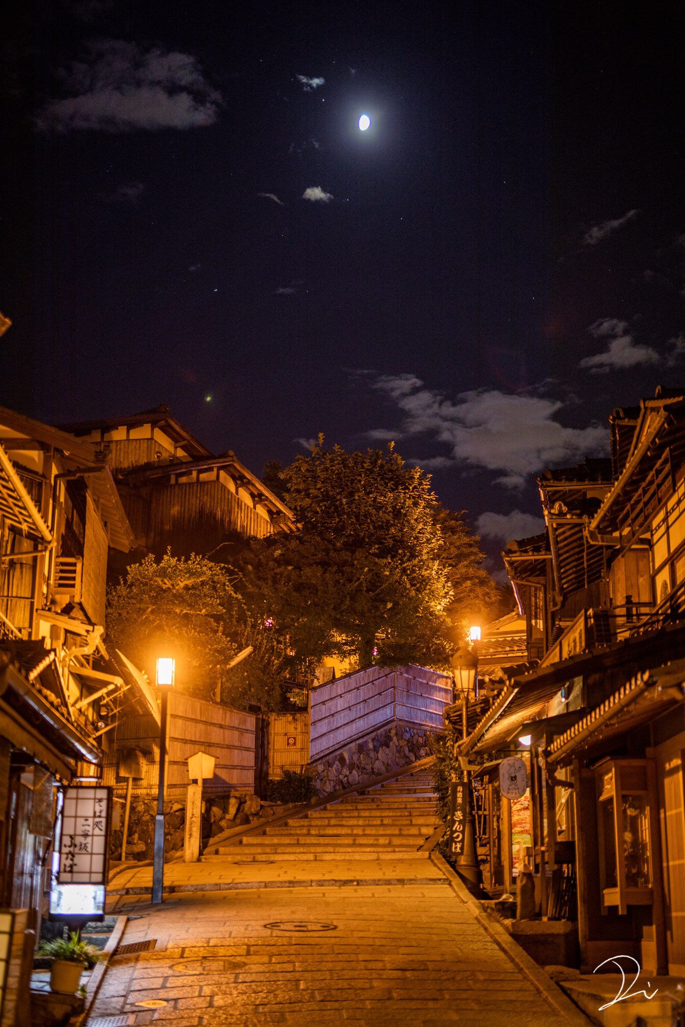 ▼一片暖色系的燈光下,石砌的街道、兩旁帶有歷史風味的木造建築,搭配頭頂的半月、綠樹,讓隨處可見的屋簷、布簾與招牌都成為絕美景色的一部分。