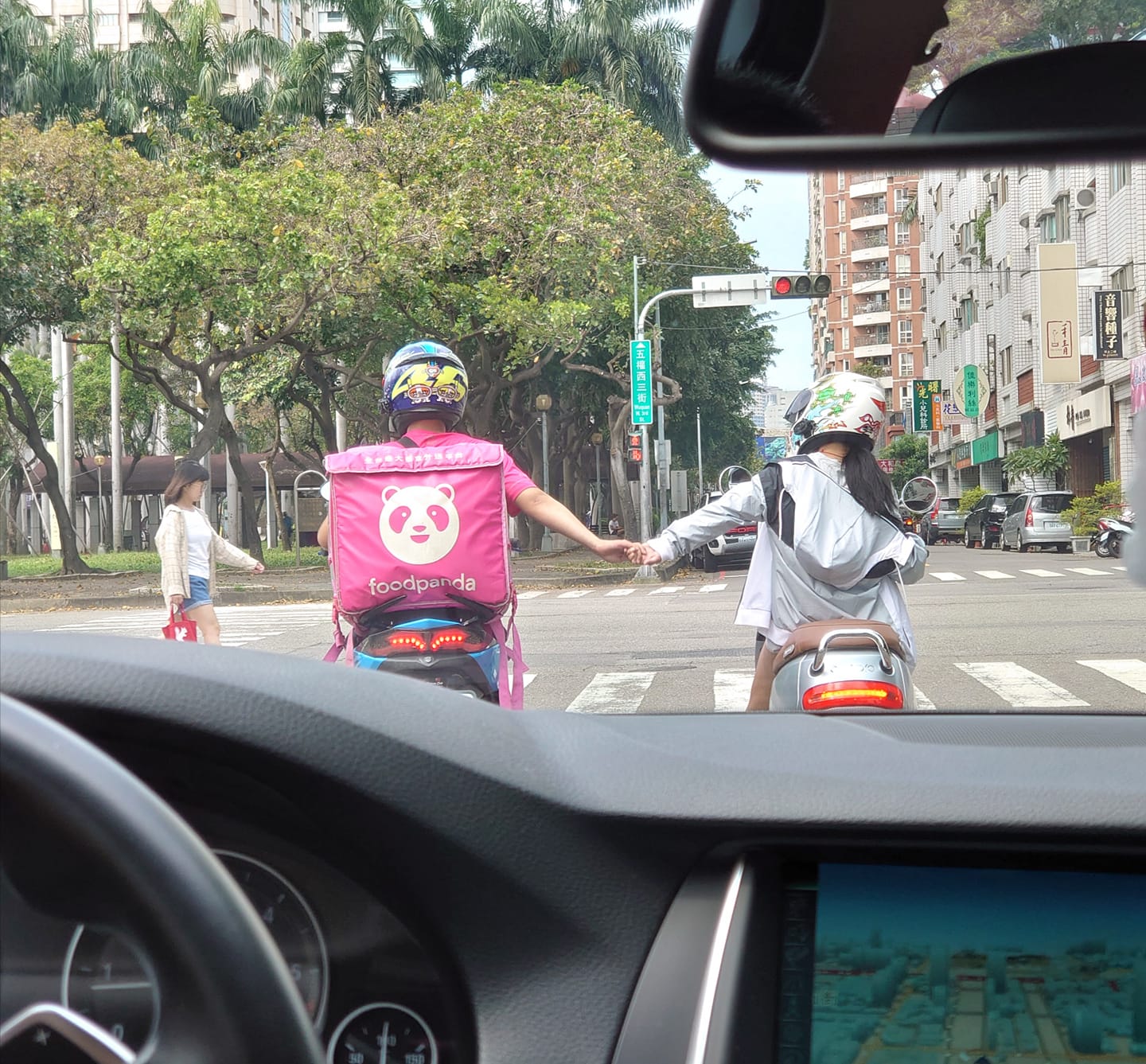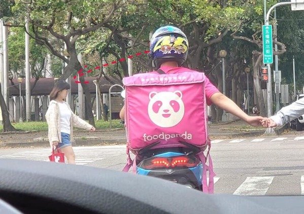 ▼當時這名BMW駕駛在台中五權酉三街的路口等紅燈,赫然發現前方Foodpanda外送員的右手緊緊牽著旁邊的女騎士。他們應該是一對情侶,雖然秒數只剩16秒,但還是捨不得放開。原po為照片配上標語說:「寶貝,這單接完就跟你約會!」