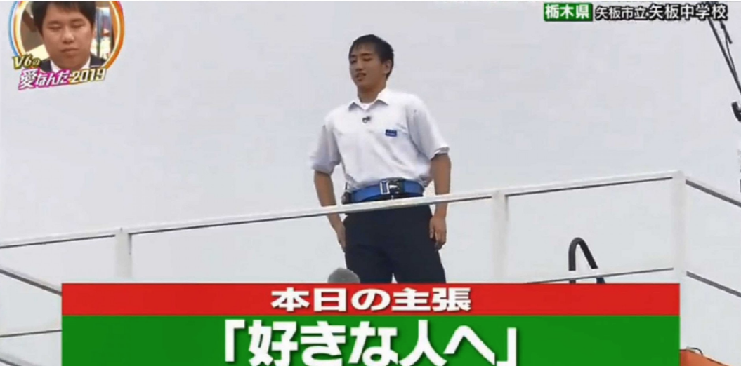 2019年09月27日日本經典節目《校園瘋神榜》有一個非常受歡迎的單元叫「未成年主張」,可以讓學生踏上屋頂吶喊心聲。雖然節目已經停播多年,但是最近TBS電視台特備節目《V6の愛なんだ2019》卻讓這個單元復活,而且還有男同學大膽同時跟2女告白!