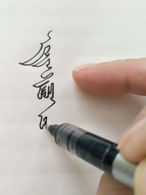 ▼寫豎排連筆空心字,先從上往下寫字的左邊邊,再從下往上寫字的右半邊,中間沒有停頓,最後在起筆處收筆,沒有扎實的功底一定寫不來。