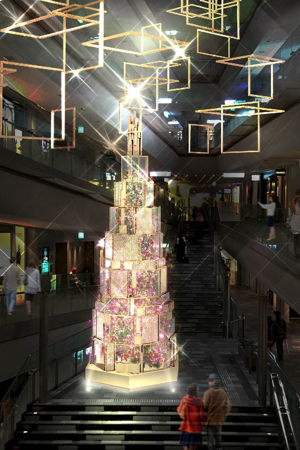 2019年表參道Hills 將以「水的魔法」為主題,以40個特別構造的金邊水箱圍著7公尺高的聖誕樹,水量將透過隨著音樂和燈光產生變化,展現出表參道的時尚氛圍。