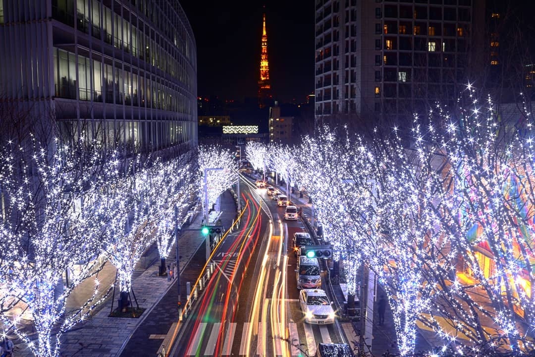 這裡是每年東京最熱門的賞燈景點之一,全長約400公尺的街道都被約70萬顆藍白燈飾點綴,讓人仿佛置身於銀河當中,還可以拍得到東京鐵塔!