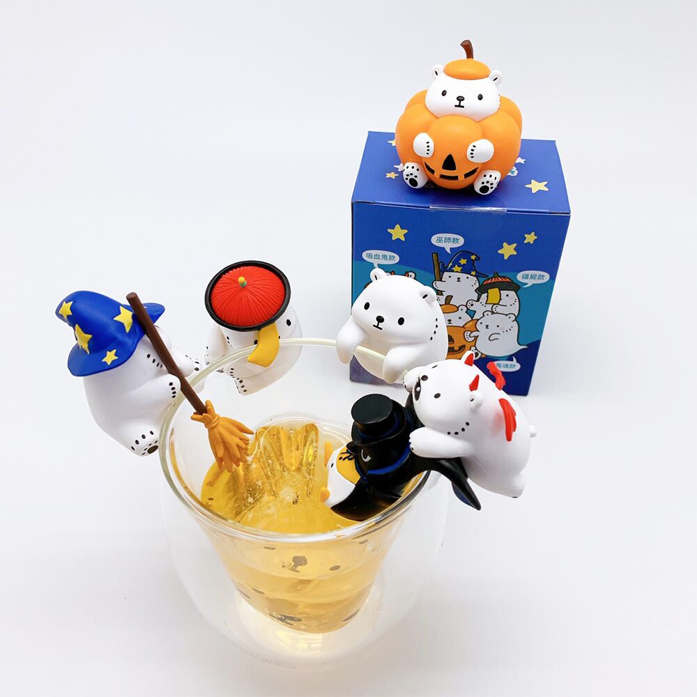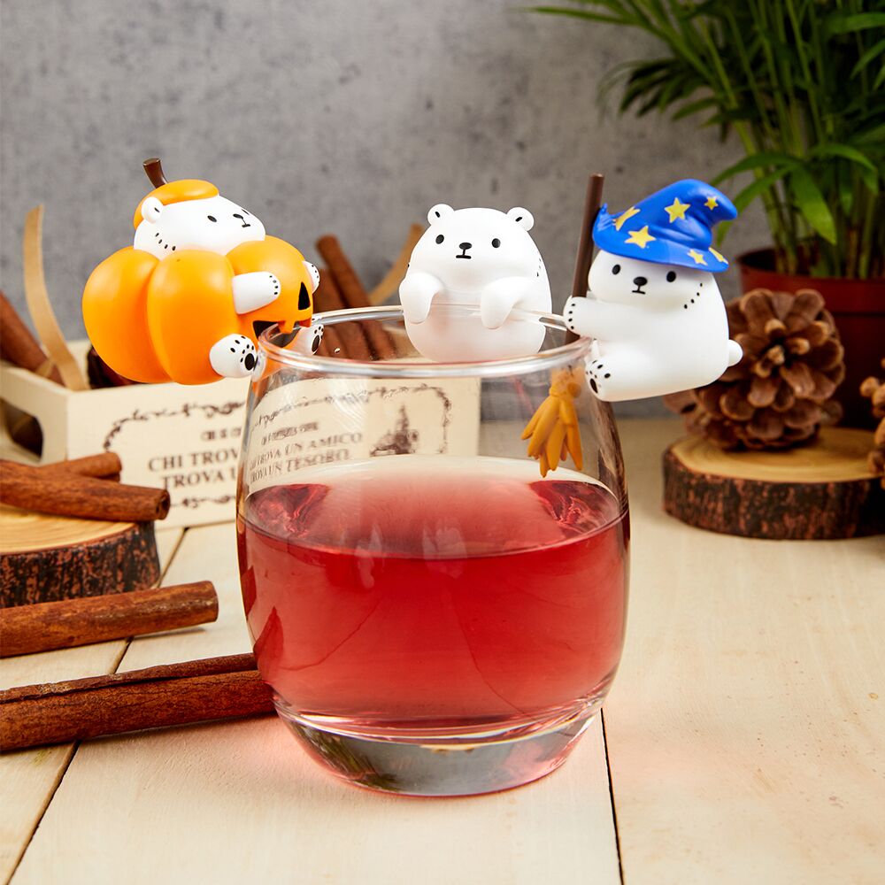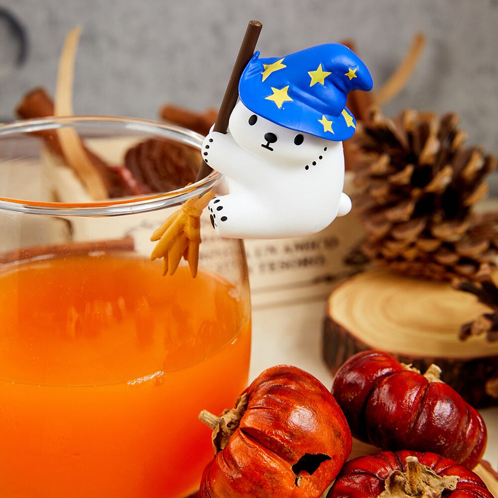 ▼帶著清朝的官帽,貼著一張黃黃的符咒,中國風的殭屍白白在萬聖節當然也不缺席。不但可以用趴的攀在杯緣、也能用符咒掛著,手腳還可以當作吸管架,北極熊瞬間變白色無尾熊,怎麼這麼可愛啦!