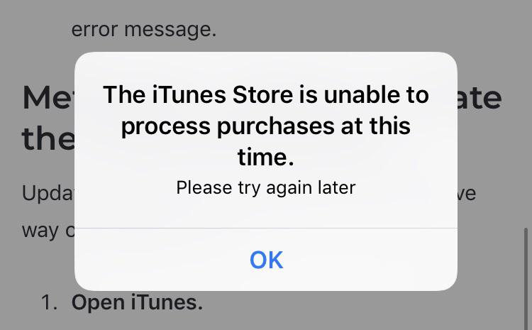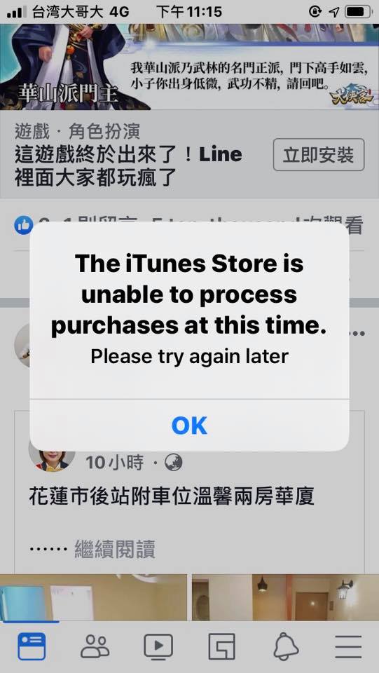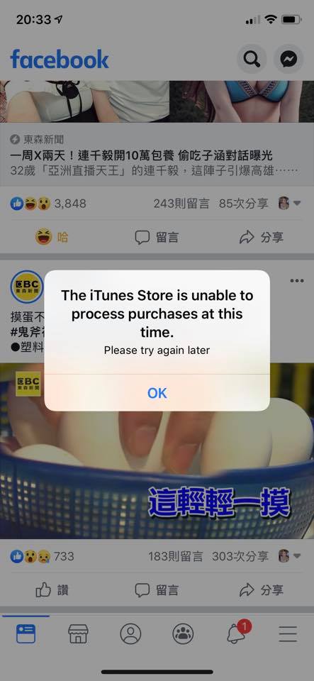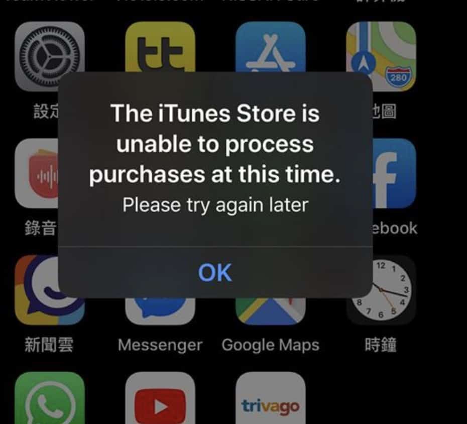 2019年10月09日8日晚間有不少果粉在網路上反映iPhone出問題,只要開啟手機App就會有「The iTunes Store is unable to process purchases at this time」視窗畫面跳出來!不論試了多少方法都無法讓它完全關閉,引起大家的討論。