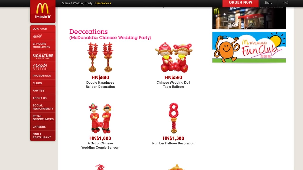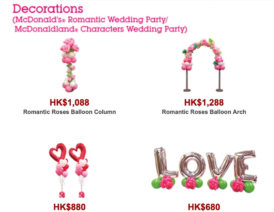 ▼如果還想要為婚禮現場增添氣氛,麥當勞也提供了中式和西式的婚禮氣球裝飾品可供選擇。