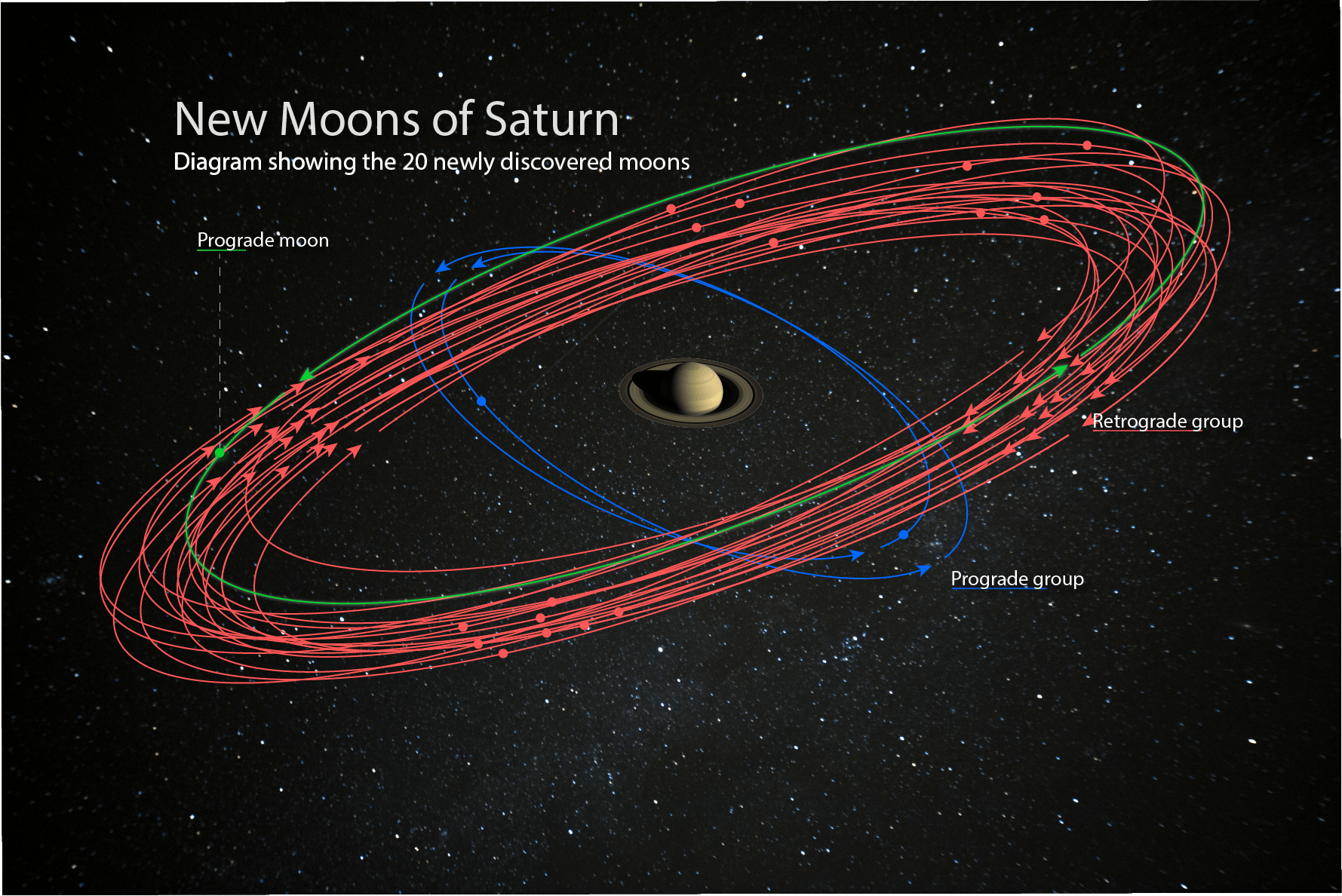 ▼這新發現的20顆衛星,直徑都約有5公里左右,多達17顆是逆行土星,只有3顆是順行的。而這3顆順行的衛星當中,其中2顆繞著土星公轉一周需要2年的時間,另一顆則需要3年!科學家也推測,這些衛星很可能是土星在40億年前形成之後,其引力吸引了經過的小行星和彗星,讓它們從此圍繞著土星旋轉。