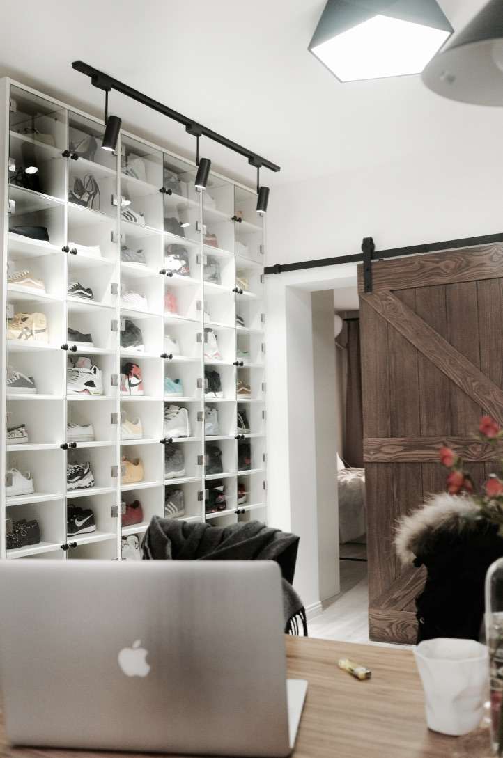 ▼最貼心的可能是拉門旁的巨型鞋櫃了,這72格鞋櫃每格可放兩雙鞋,為的就是讓老公可以展示他的收藏球鞋。