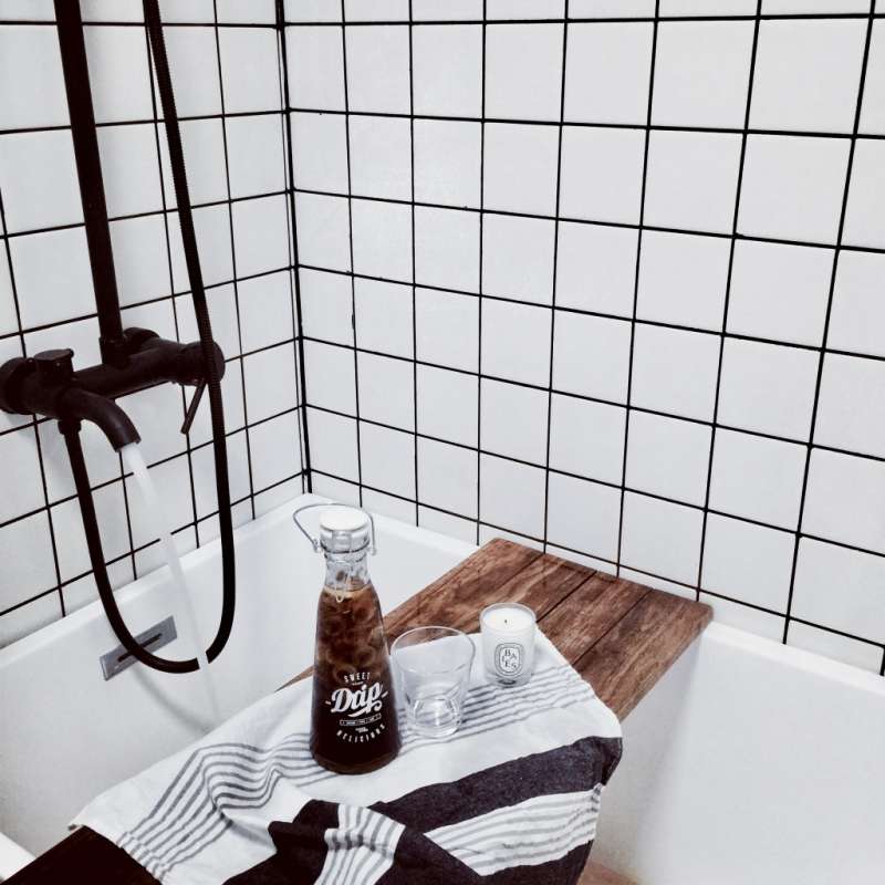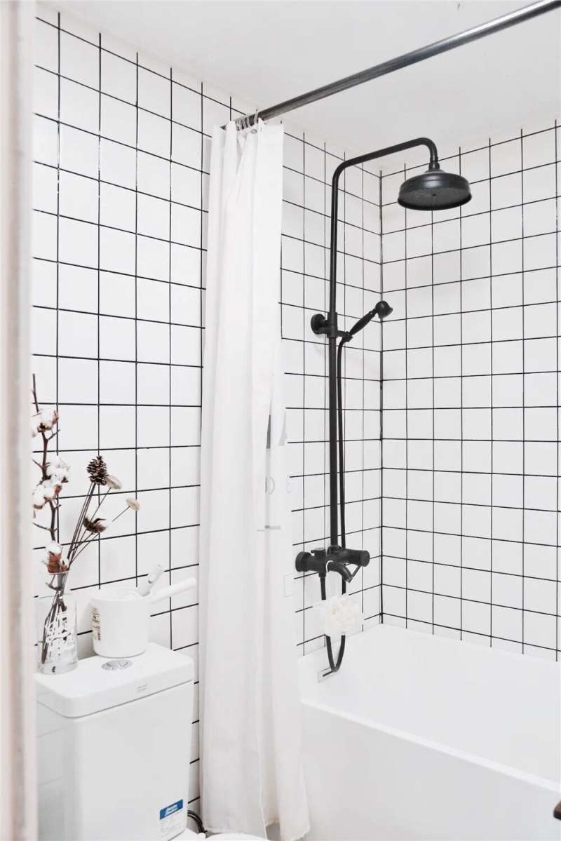 ▼老舊的浴室也是全部換掉重弄,磁磚一樣是簡約的黑白風,如今還有了乾濕分離與浴缸呢!