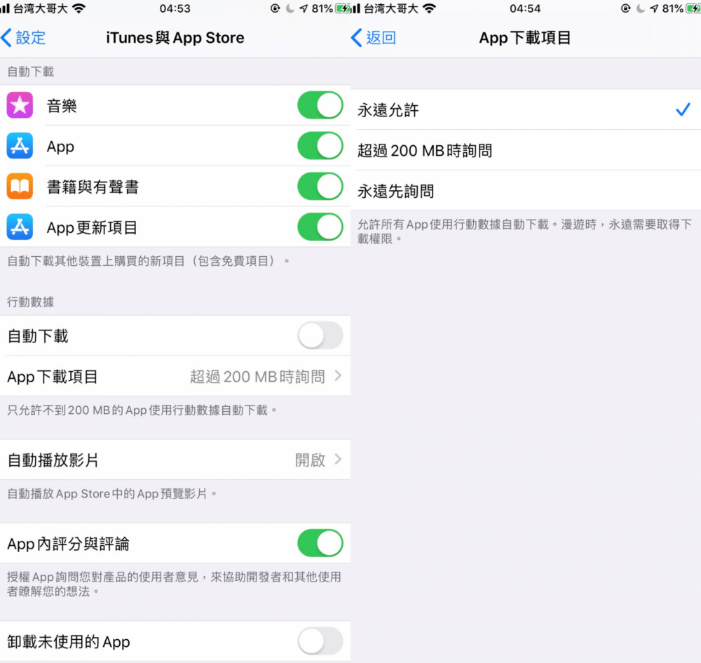 ▼7. 取消200MB下載限制:下載遊戲或App的時候,容量超過200MB只能透過Wifi下載,但附近沒有Wifi的話就很麻煩。 iOS 13取消了這一限制,可以自行設定,下載起來更方便了。設定的步驟很簡單:進入「設定」>「iTunes與App Store」>「App下載項目」,勾選「永遠允許」就好了。
