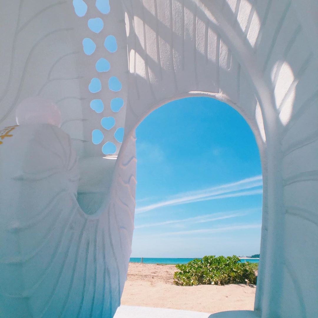 ▼佇立在沙灘上的貝殼教堂,高約五公尺、寬約四公尺,純白色的貝殼搭配無敵海景,怎麼拍都能拍出超浪漫的美照啊!