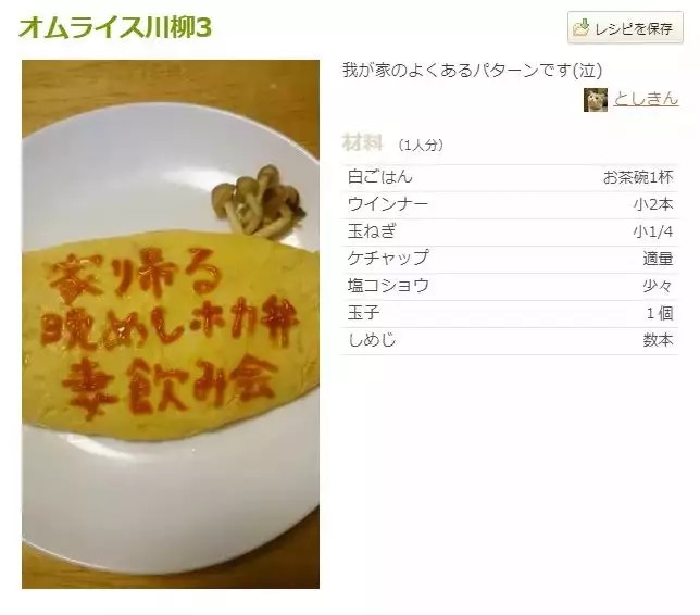 2019年10月15日日本一位上班族大叔因為老婆經常在外聚餐,只能自己解決晚飯。某天他下班回家,發現老婆又不在,於是簡單做了一份蛋包飯,並表示:「這種情況在我家是經常發生的。」他將照片po到網路上,之後一發不可收拾。