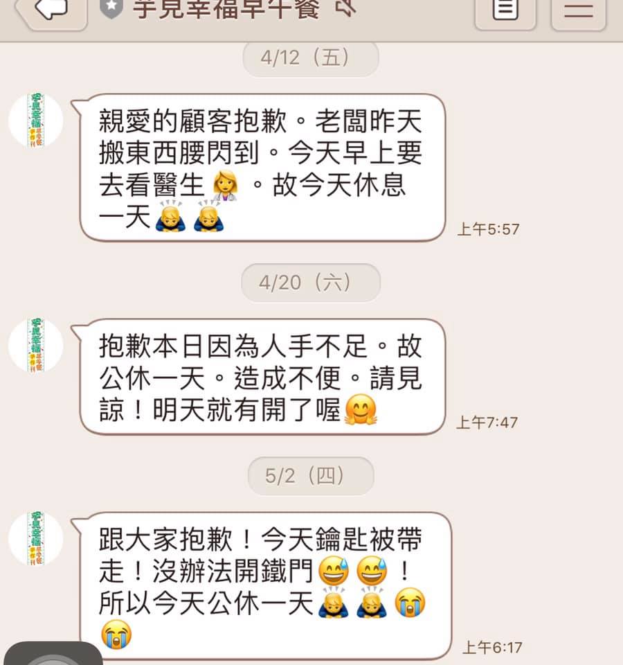 不小心落枕、被情侶閃到就休店 台早餐店老闆的「公休理由」各種鬧