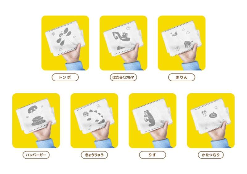 ▼每一張廁紙上都有可愛的圖案,比如蜻蜓、挖土機、長頸鹿等等,小朋友擦屁股時,讓便便附著於紙上,就能補全圖案啦~