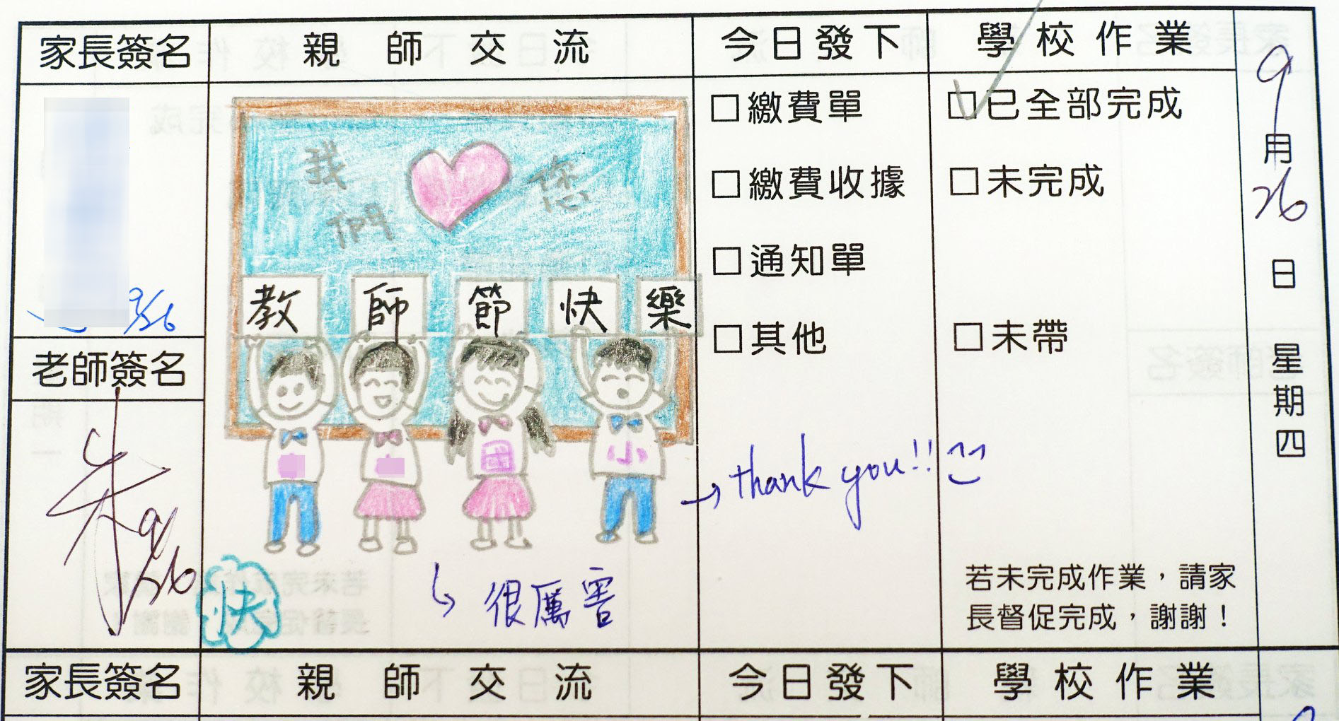▼不但中秋節畫上了一顆又圓又大的笑臉月亮來祝賀,就連教師節前都暖心地寫上「我們♡你」,讓老師感動的同時還不忘寫上「很厲害」三個字。