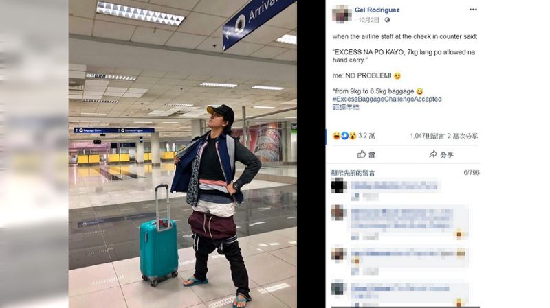 2019年10月19日搭飛機時一不小心行李超重的話,真的很麻煩。如果想不出好辦法,就只能付高額的費用啦。菲律賓一名女網友登機時遇到了這樣的問題,幸好她的行李箱裡裝的大多是衣服。為了省錢,她乾脆把衣服全都穿到身上~