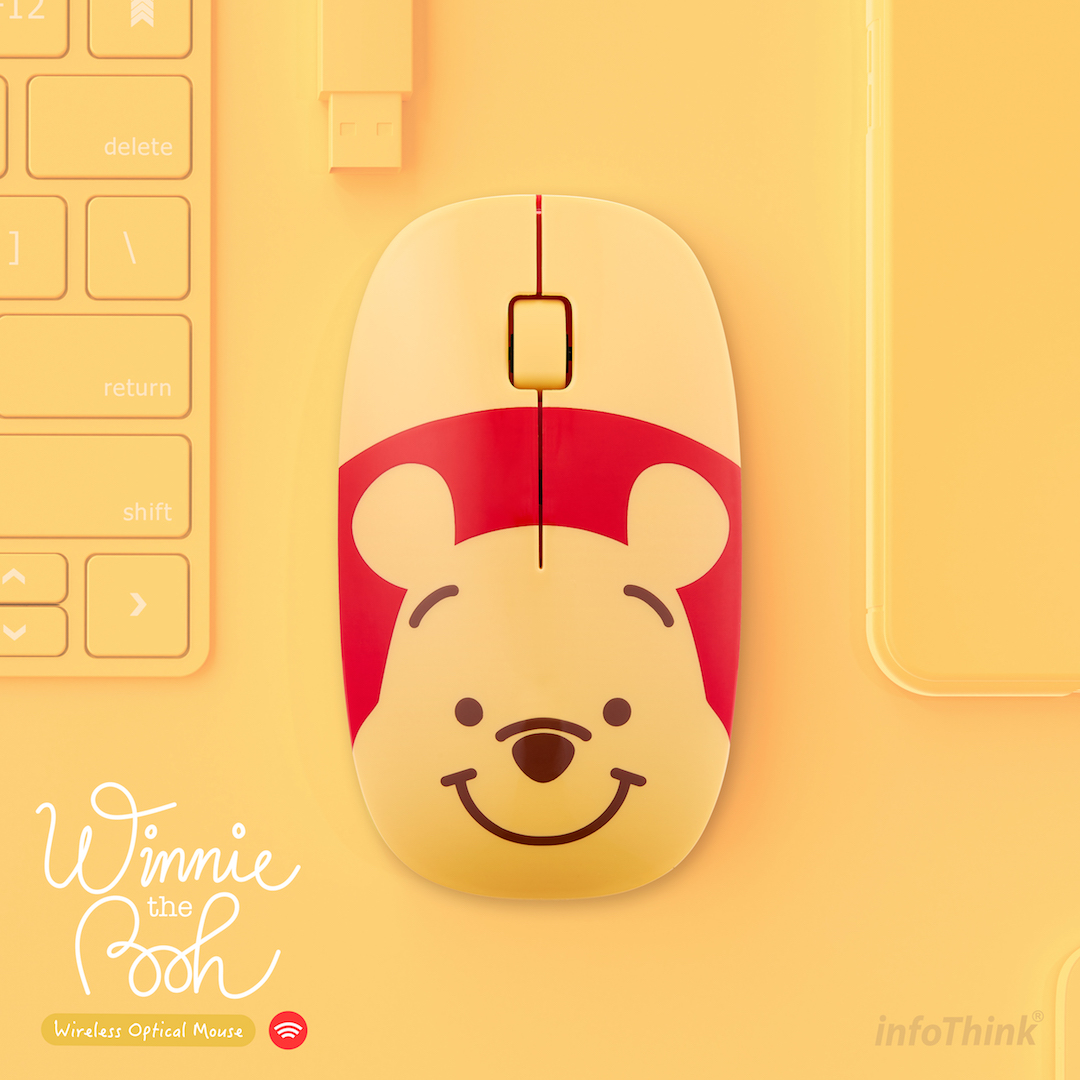 ▼小熊維尼無線光學滑鼠:滑鼠上有一個維尼大臉蛋,搭配維尼經典紅衣與蜂蜜色系,不論是辦公、或是在家用電腦,都能帶給你滿滿的好心情。