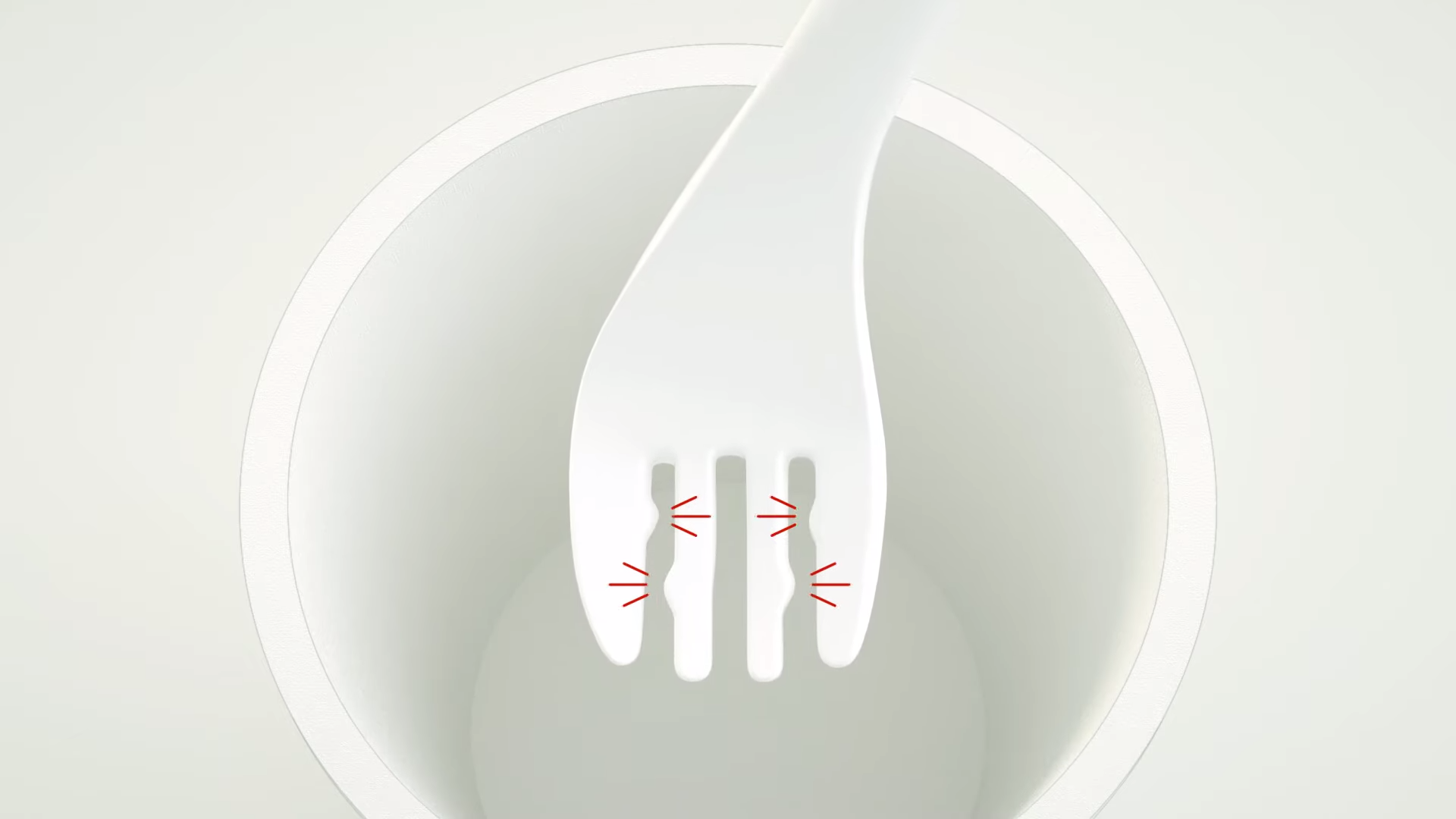 ▼叉尖上設計的突起,則是為了讓麵條可以順利掛在叉子上,不會脫落;而叉身上做出微微的弧度,可以拿來撈泡麵裡的小肉塊、蔬菜等料。