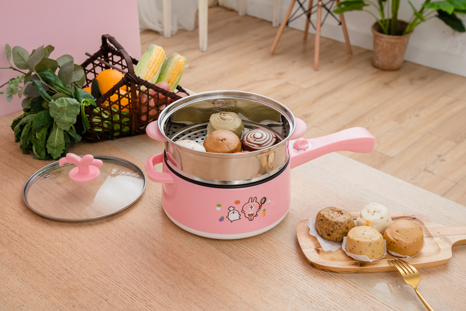 ▼幸福便利鍋:內層不沾鍋鋁合金,附有304不鏽鋼蒸鍋;雙層防燙、防乾燒設計,2公升大容量,蒸煮煎一鍋多用,讓卡娜赫拉陪你出好菜!